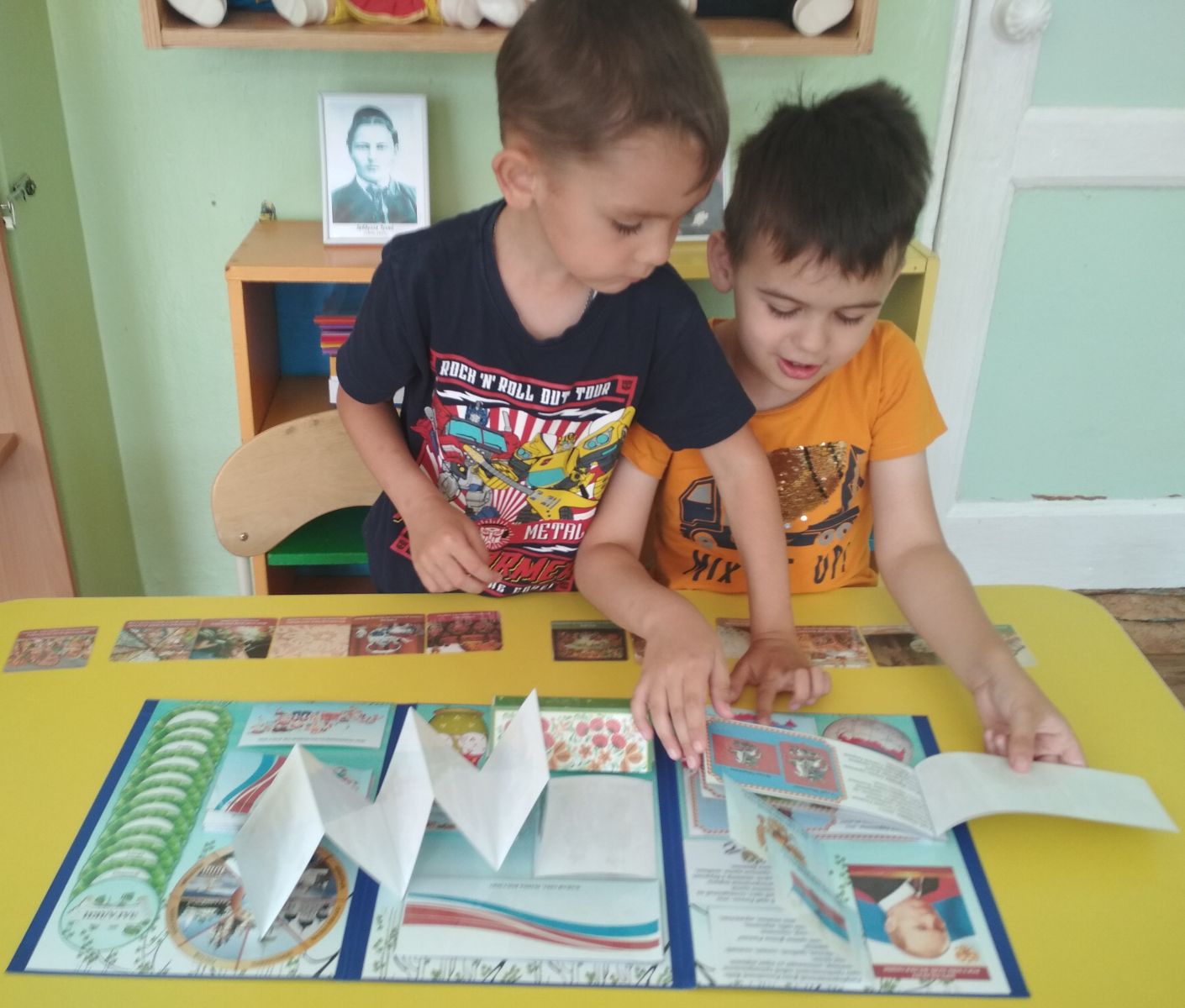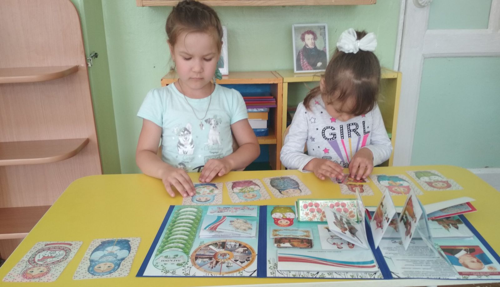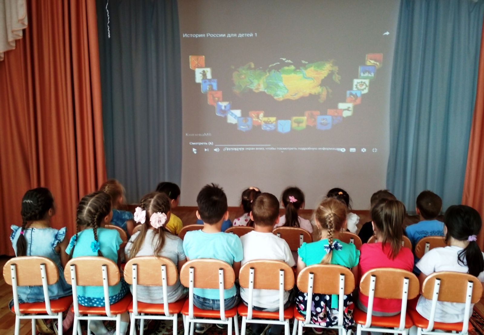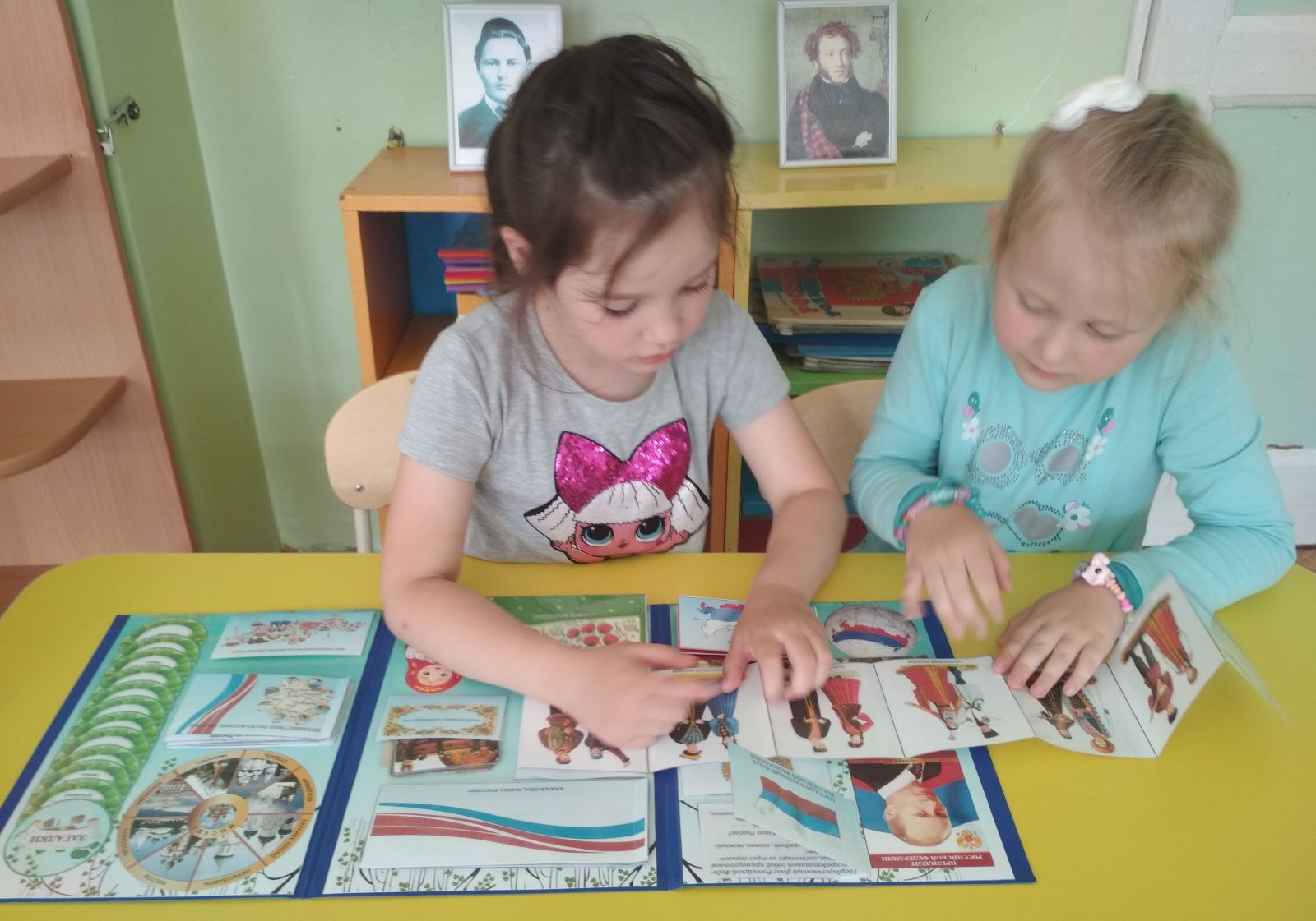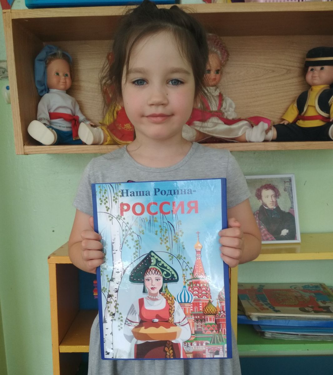 играли в дидактические игры «Русский сувенир», «Укрась дымковскую игрушку», «Выбери флаг и герб Российской Федерации»; просмотрели мультфильм «История России для детей», прослушали государственный гимн Российской Федерации (муз. А. Александрова, сл. С. Михалкова), песню «С чего начинается Родина» (муз. В. Баснера, сл. М. Матусовского); читали такие произведения, как: рассказы С. Баруздина «Волга-кормилица», «На берегах трёх морей», стихотворение З. Александровой «Родина», рассказ Г. Цыферова «Россия», играли в русские народные игры: «Краски», «Фанты», «Колечко».