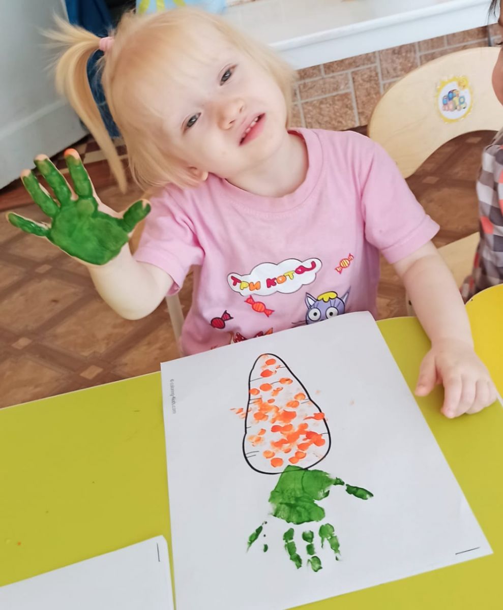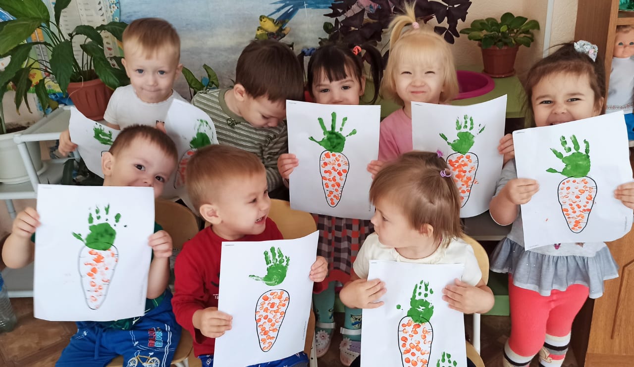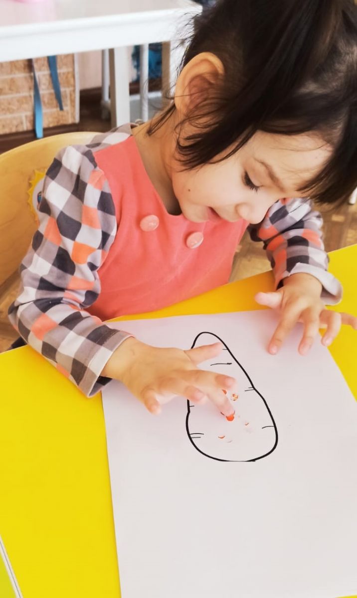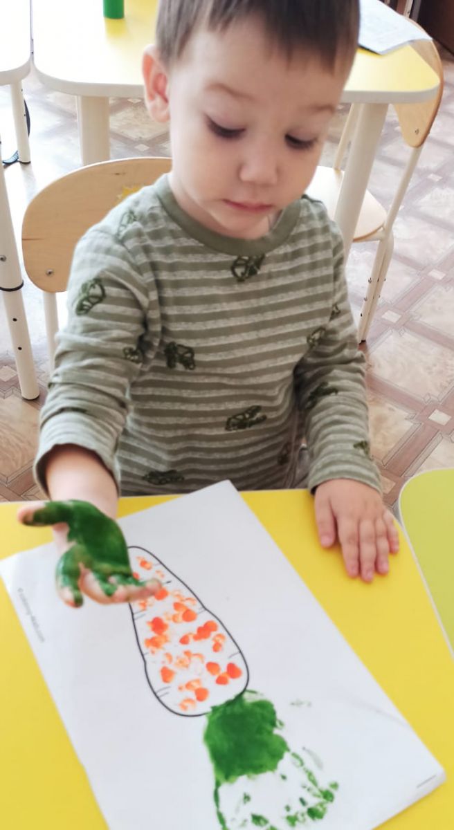 На занятии по художественно-эстетическому развитию воспитанники рисовали пальчиками морковку для зайчика.