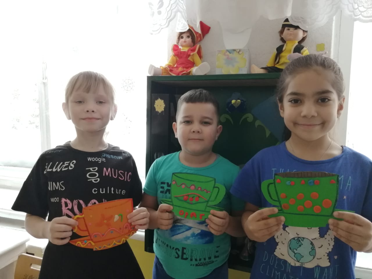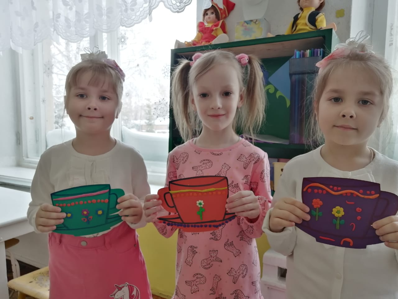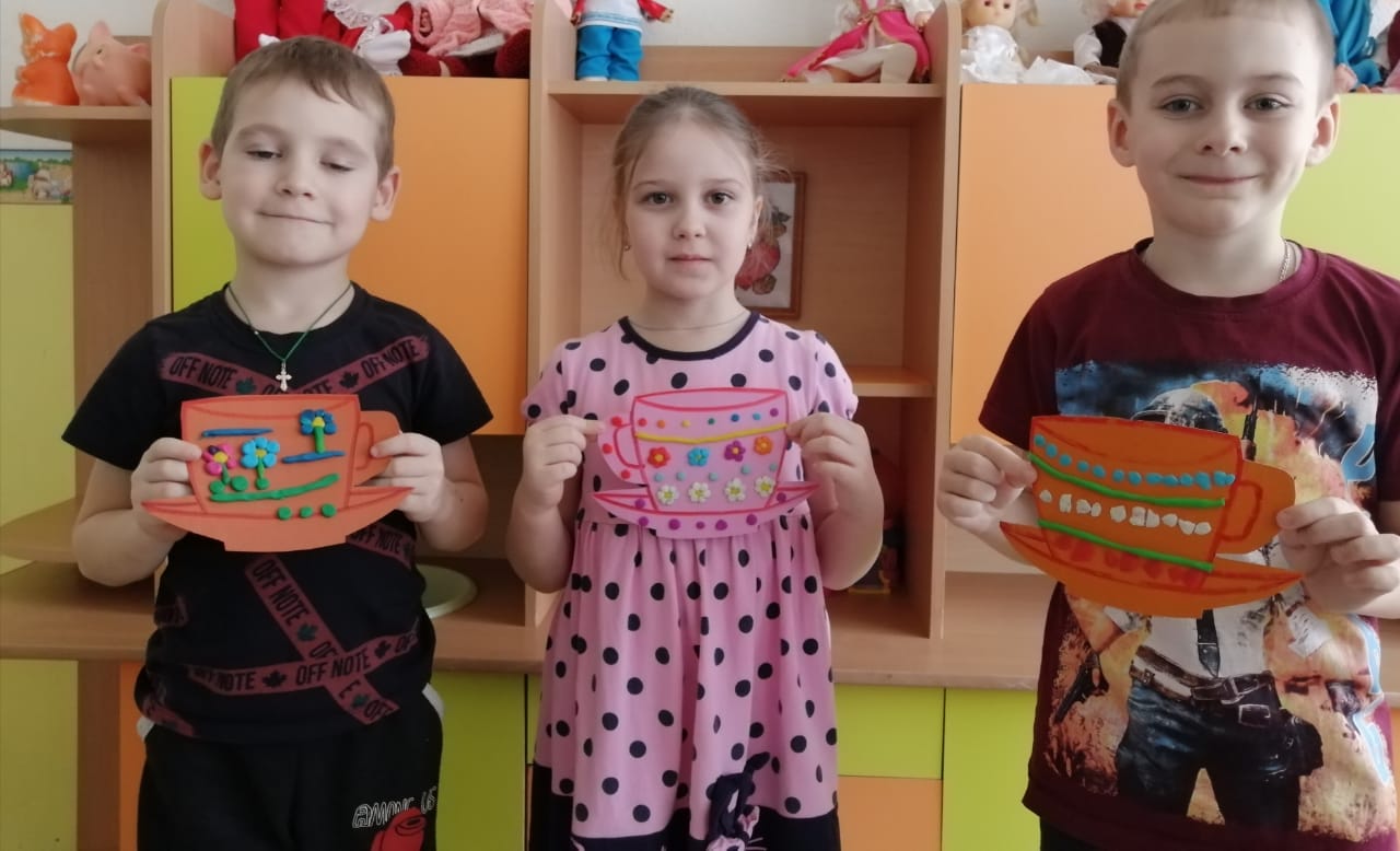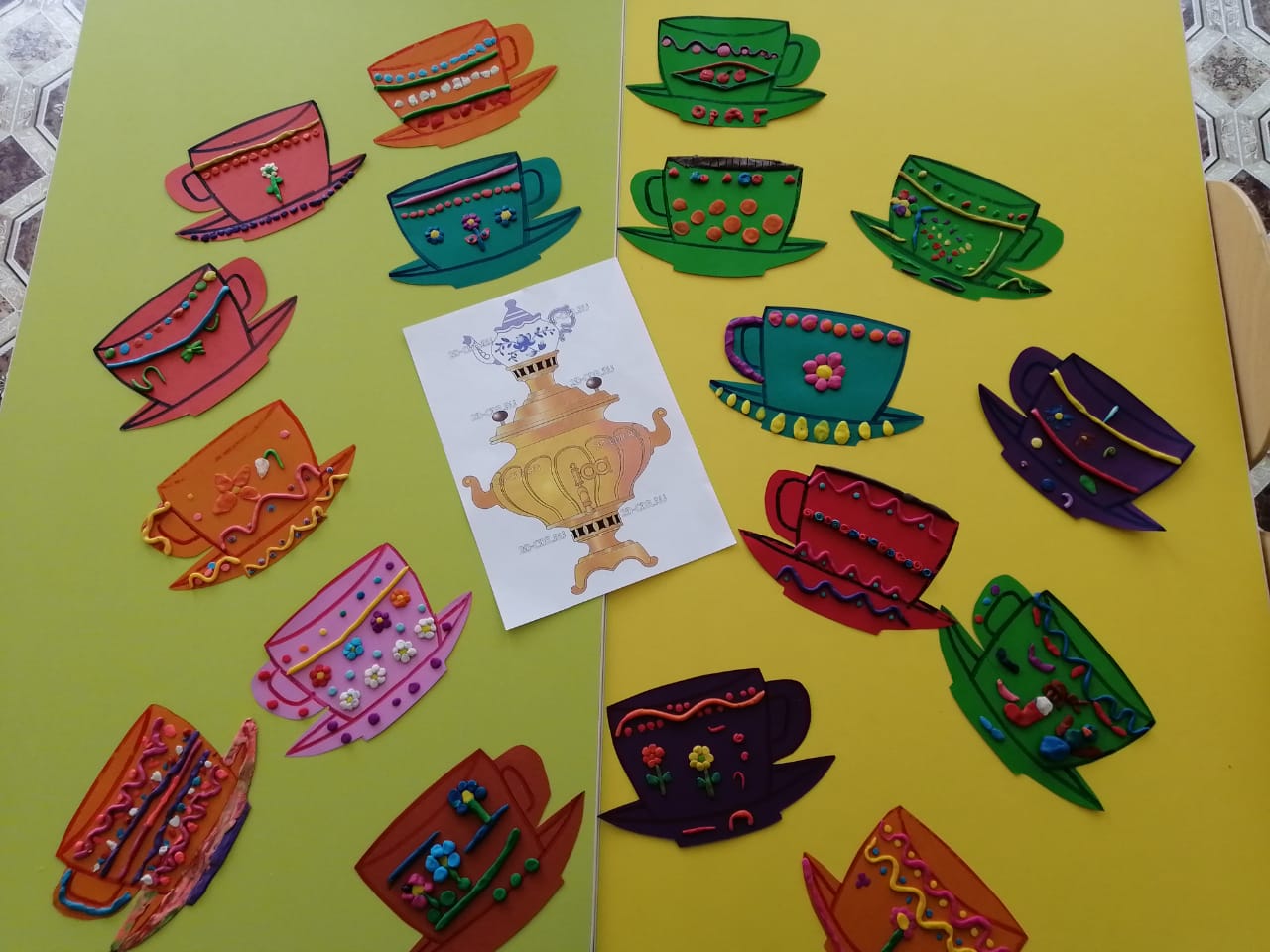 Творческой работой была работа с пластилином. Дети украшали чашки с блюдцем к "чаепитию". Данный вид работы детям очень нравится, т.к. здесь они могут проявить своё творчество и фантазию.