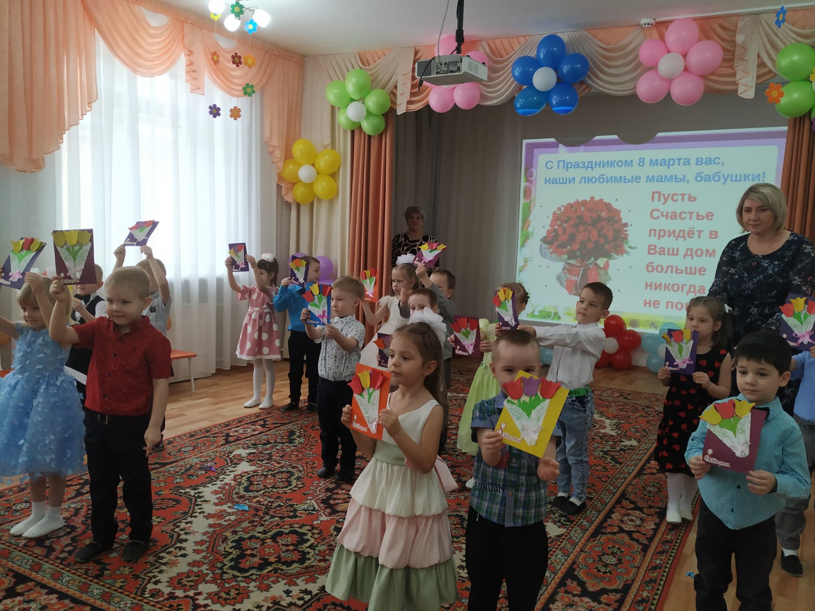 В конце праздника дети вручили мамам и бабушкам праздничные открытки, сделанные своими руками, чем приятно порадовали милых женщин.