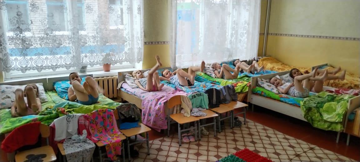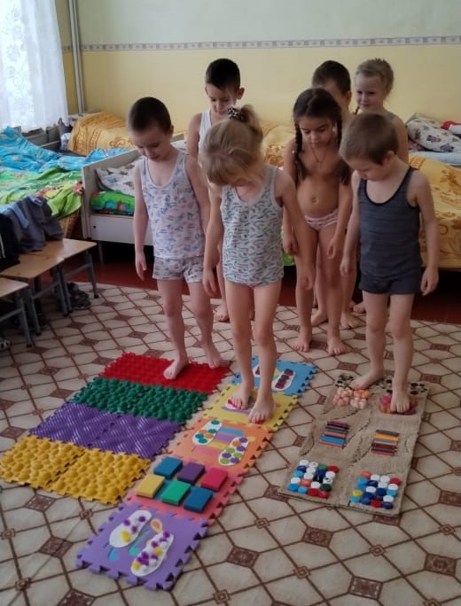 По окончании тихого часа ежедневно делали гимнастику после сна, ходили по массажным дорожкам здоровья.