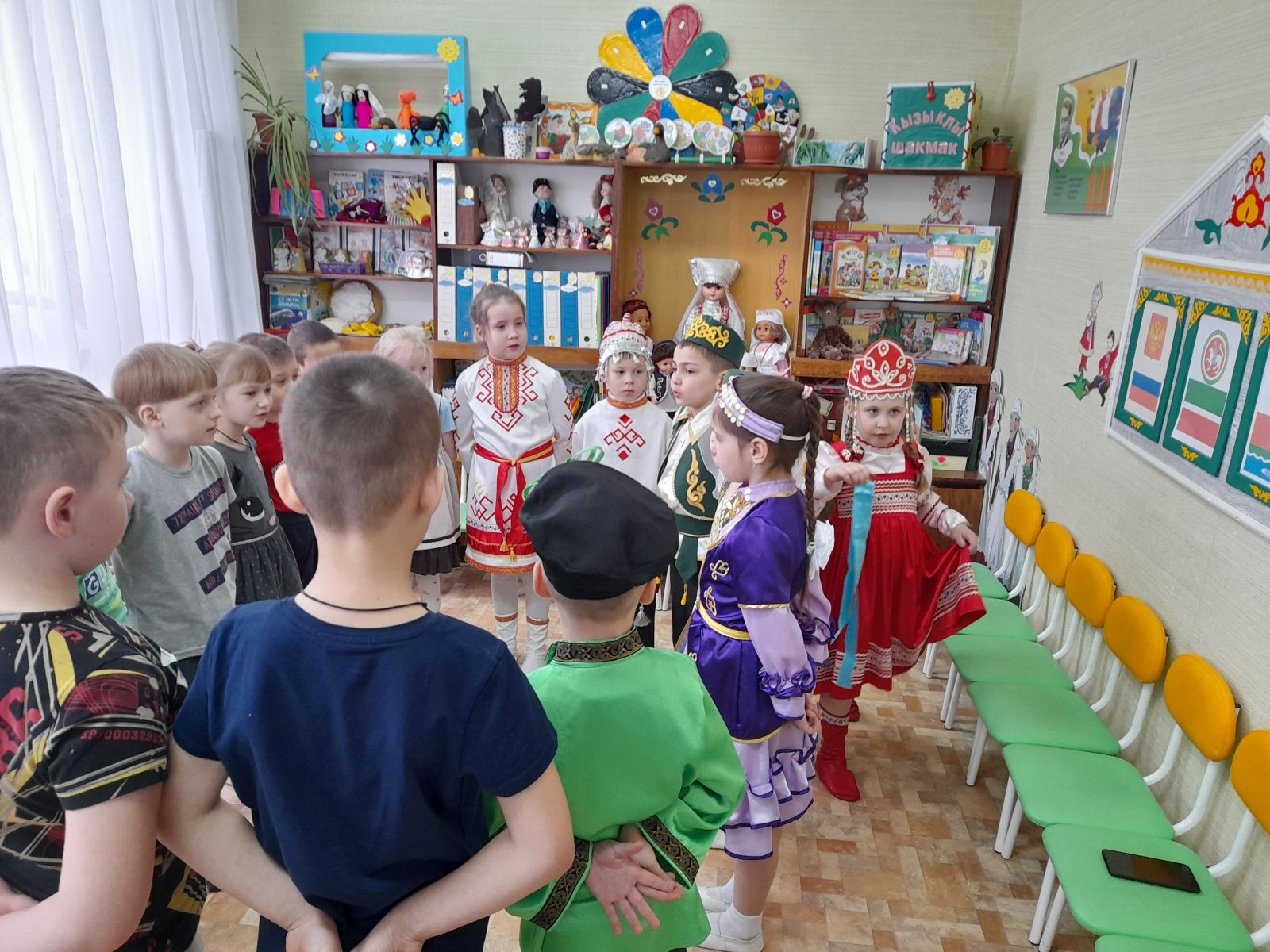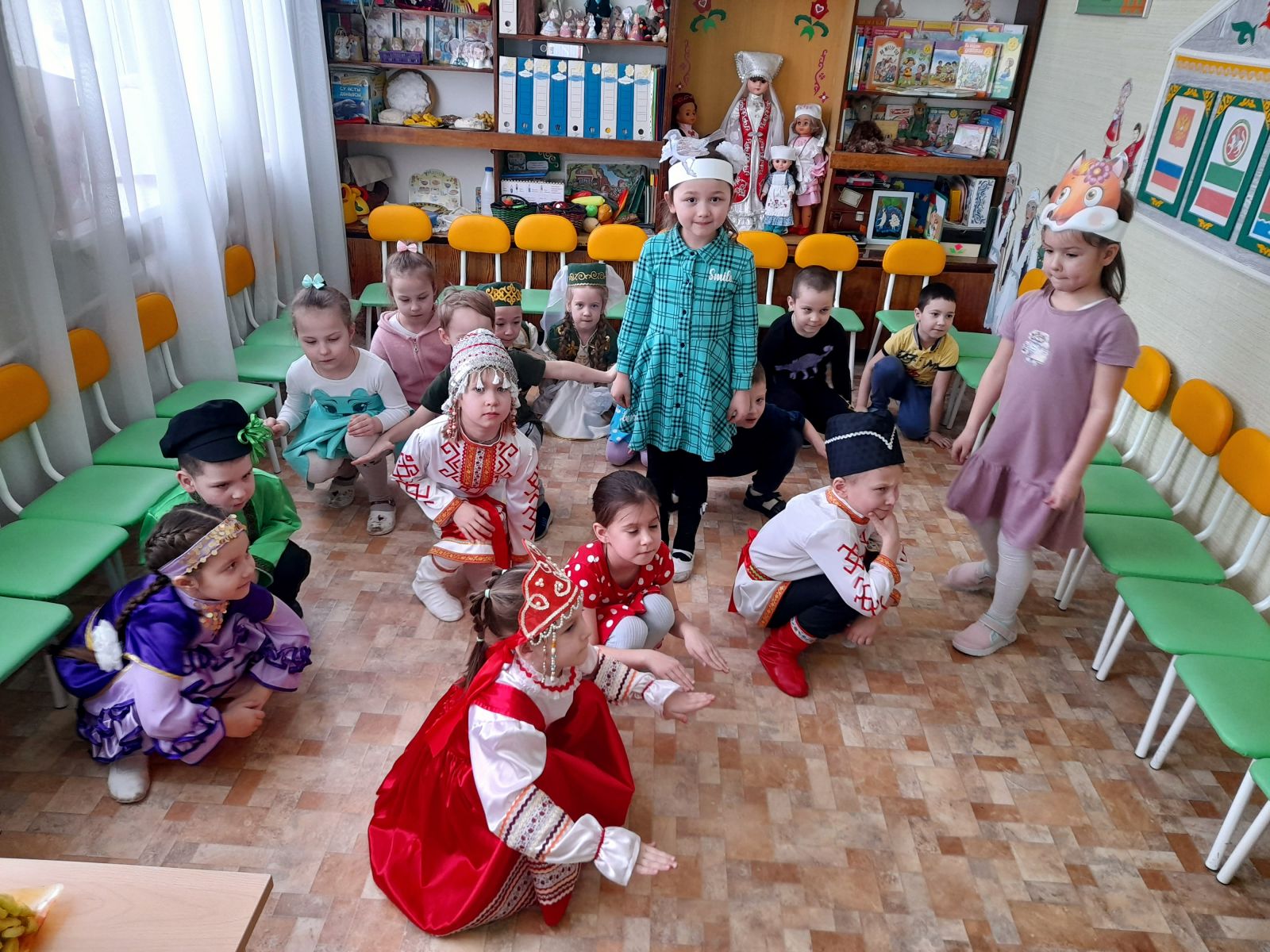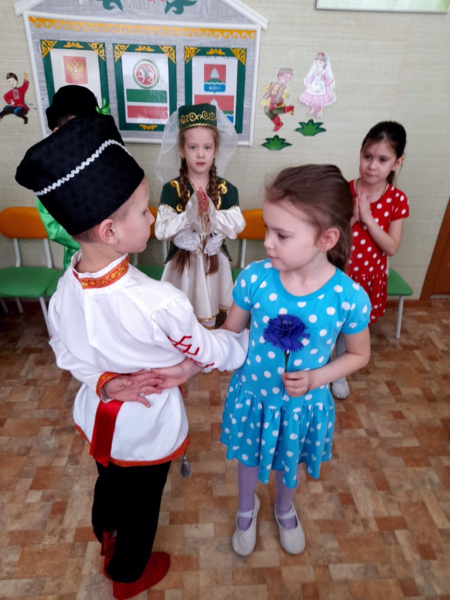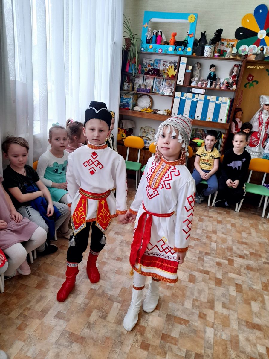 К детям на праздник пришли гости в национальных костюмах народов Поволжья. Ребята закрепили знания о различных предметах одежды, обуви, головных уборах; учились различать татарский, русский, башкирский, чувашский народные костюмы, выделяя их характерные элементы.