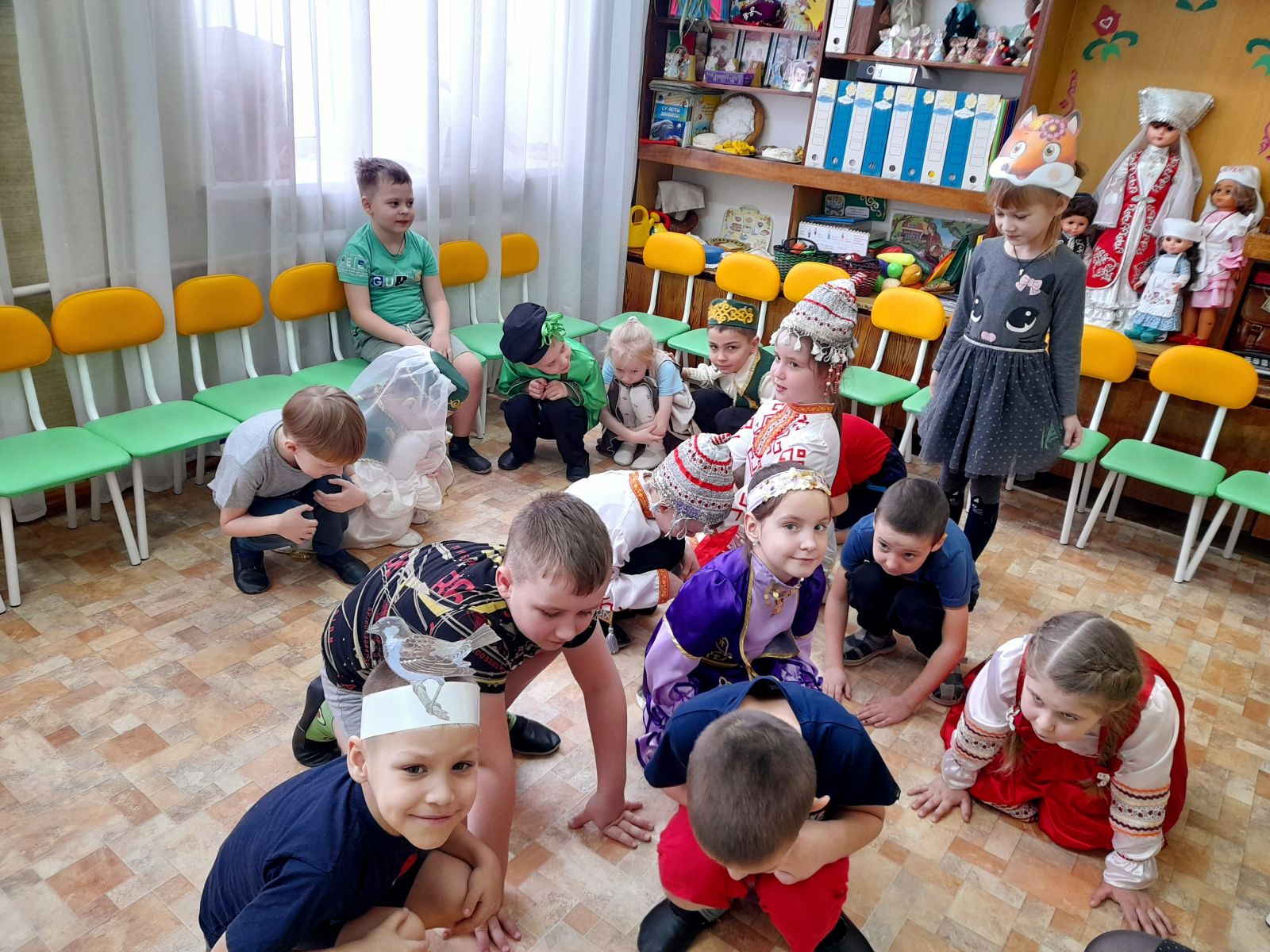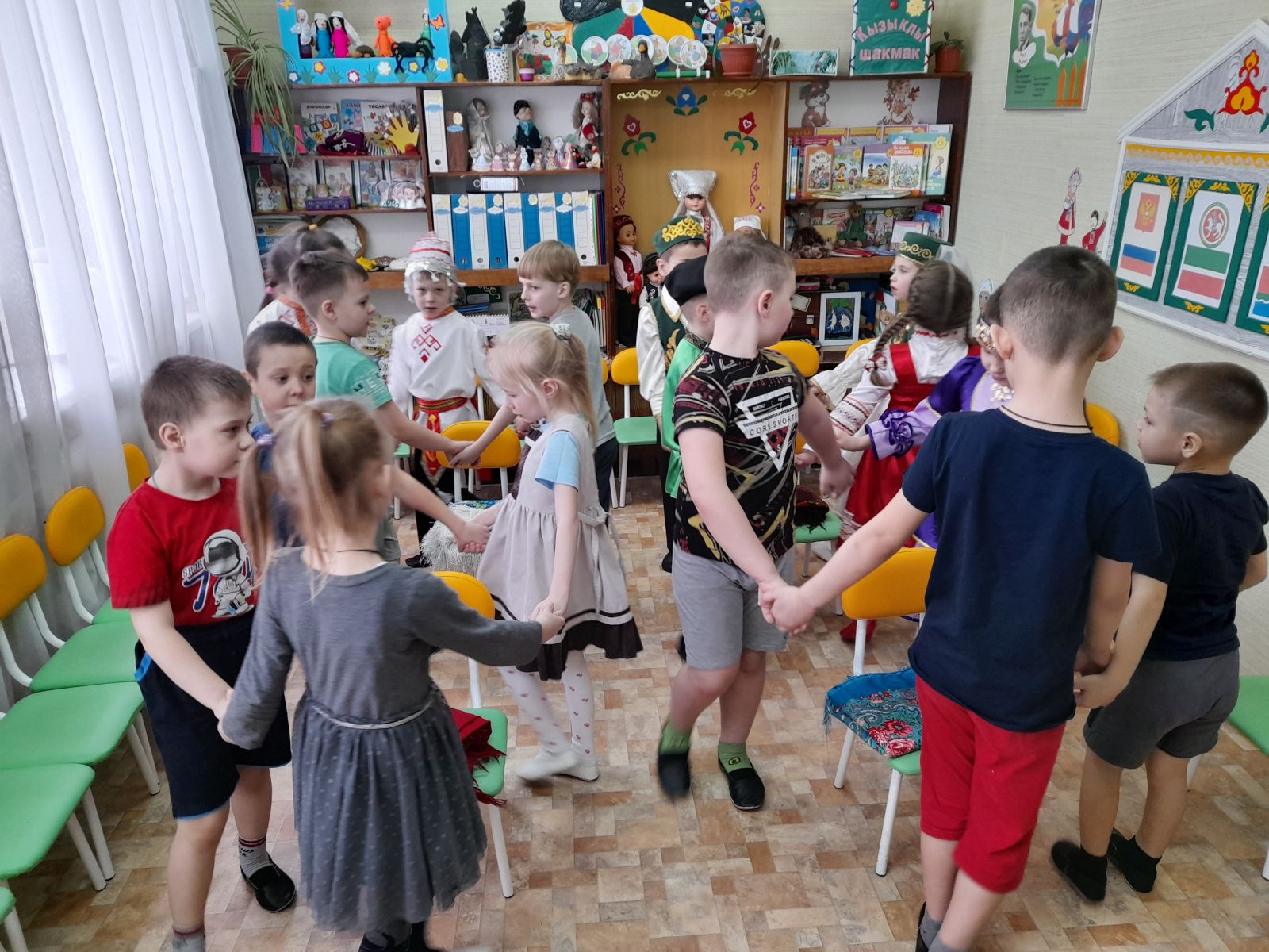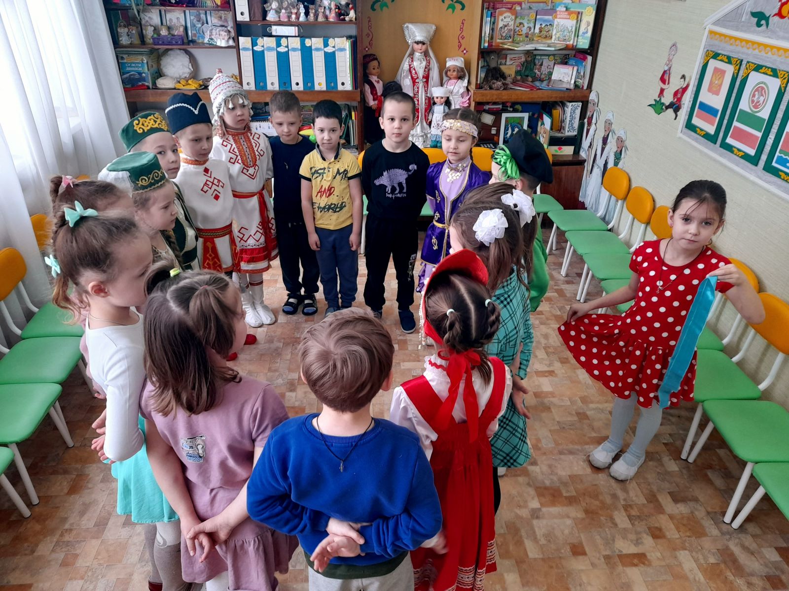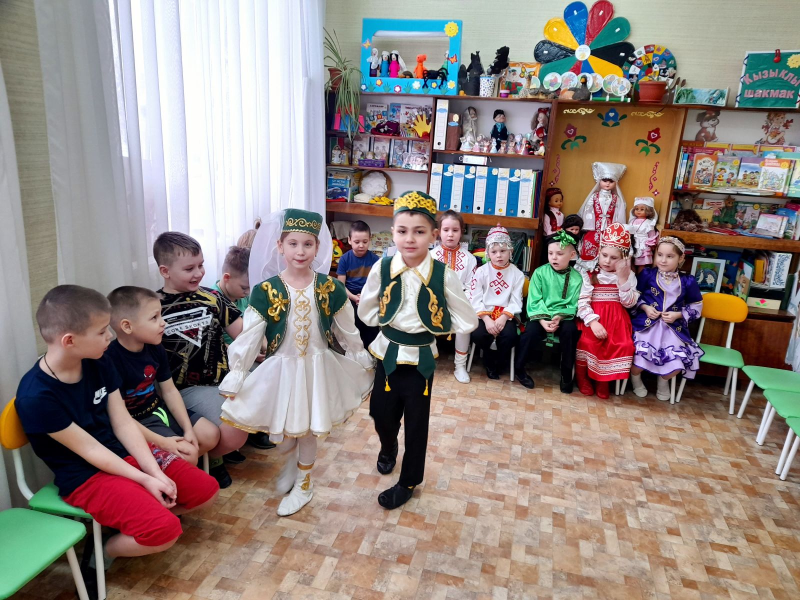 К детям на праздник пришли гости в национальных костюмах народов Поволжья. Ребята закрепили знания о различных предметах одежды, обуви, головных уборах; учились различать татарский, русский, башкирский, чувашский народные костюмы, выделяя их характерные элементы.