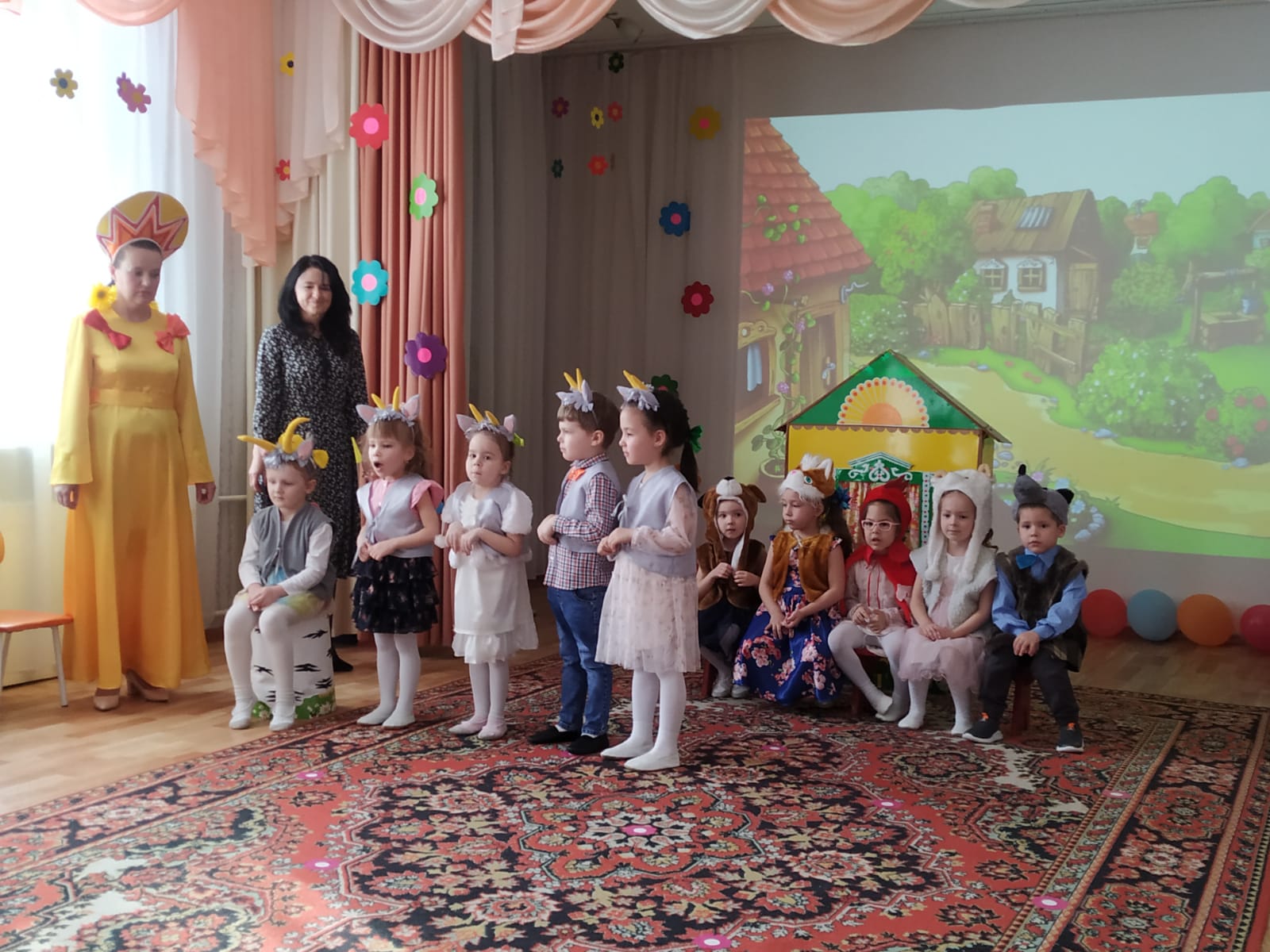 А чтобы праздник стал ярким, красочным, интересным и запоминающимся, постарались сказочные персонажи: Матрёшка (Савина О. А.), Солнышко (Ефимова Е. Х.), Весна (Бадреева Э.И.).