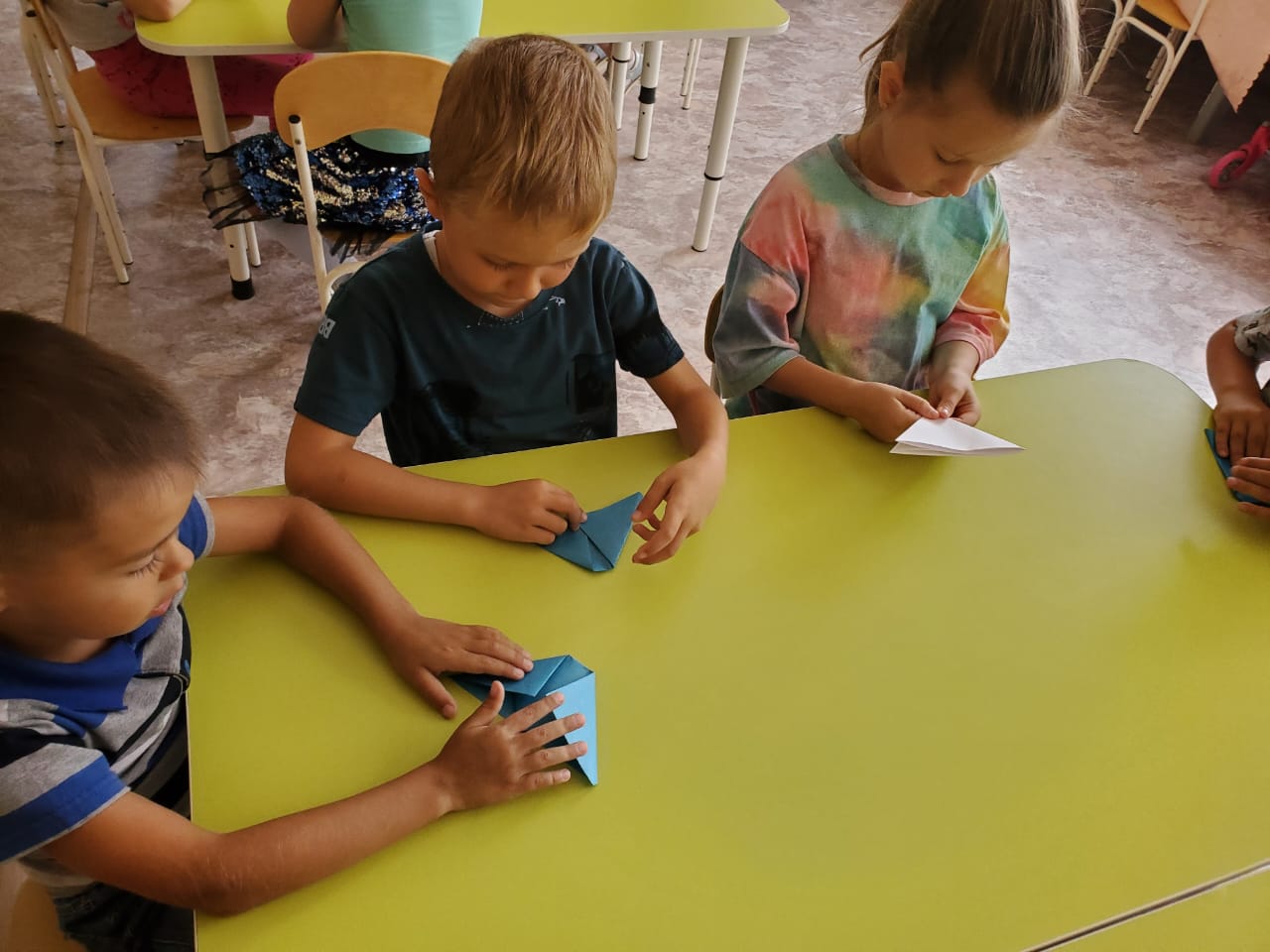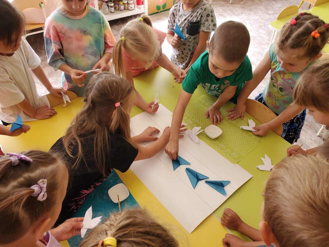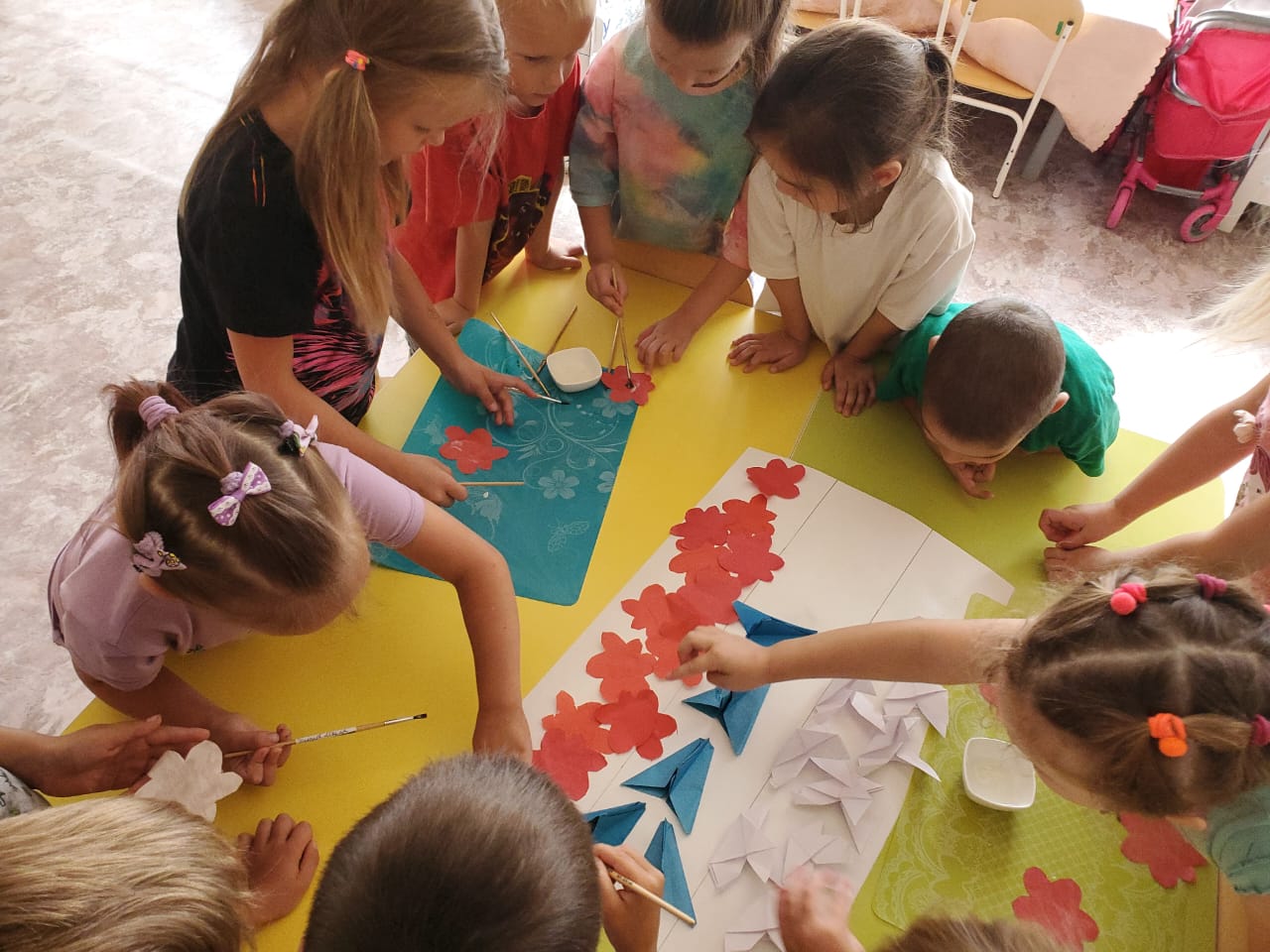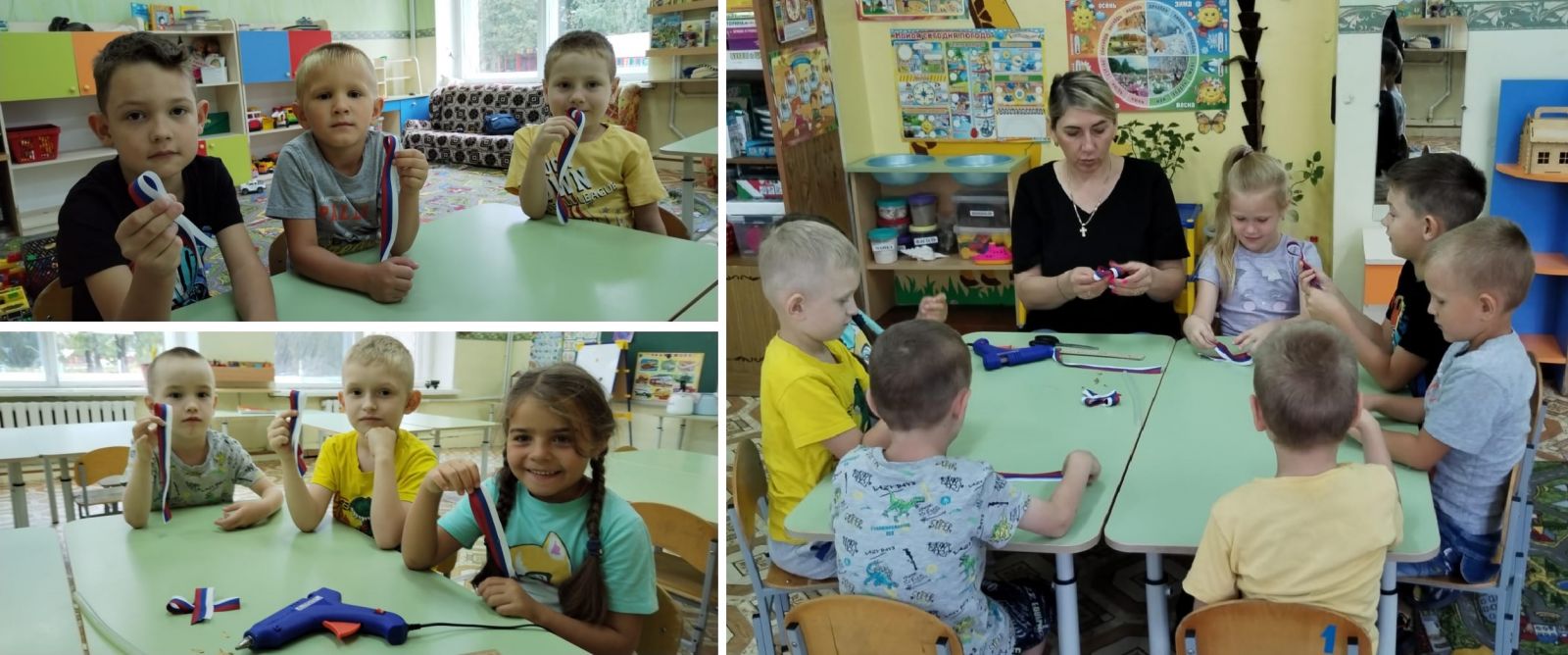 В средней группе "Солнышко" (воспитатели Деркач З.М., Бородина М.Н.) сегодня прошла творческая мастерская по изготовлению коллективной аппликации с элементами оригами "Флаг России — мой флаг".