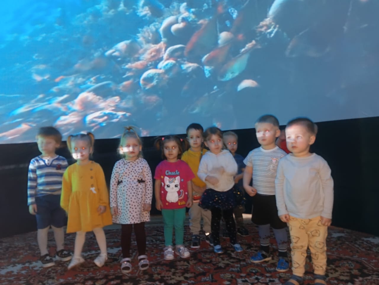 Ребята совершили захватывающее путешествие в удивительный подводный мир. Им было рассказано о царстве миллионов, не похожих ни на что обитателей: необычные растения и водоросли, разноцветные рыбки и грозные акулы, задорные дельфины и гигантские киты...