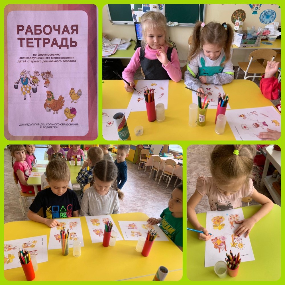 07.12.2023г. В старшей группе «Солнышко» воспитатели (Бородина М.Н., Деркач З.М.) провели с ребятами беседу на тему коррупции. Затем была работа в рабочих тетрадях по формированию антикоррупционного мировоззрения.