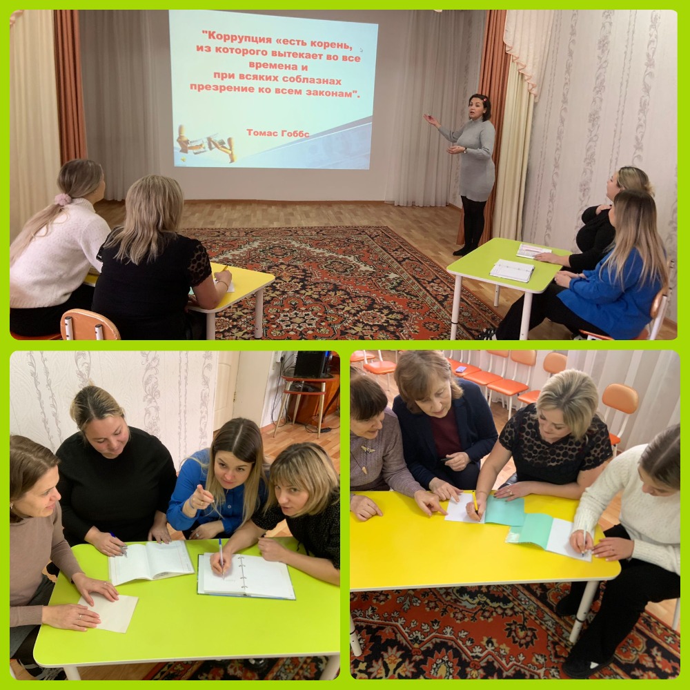 05.12.2023г. Прошло совещание с работниками детского сада на тему «Соблюдение законодательства в области противодействия коррупции» в форме семинара. Ответственный за антикоррупционную политику — Бородина М.Н. вместе с педагогами обсудили виды коррупционных правонарушений (дача взятки, получения взятки, посредничество) в форме беседы, игры. Составили памятки по теме антикоррупции.