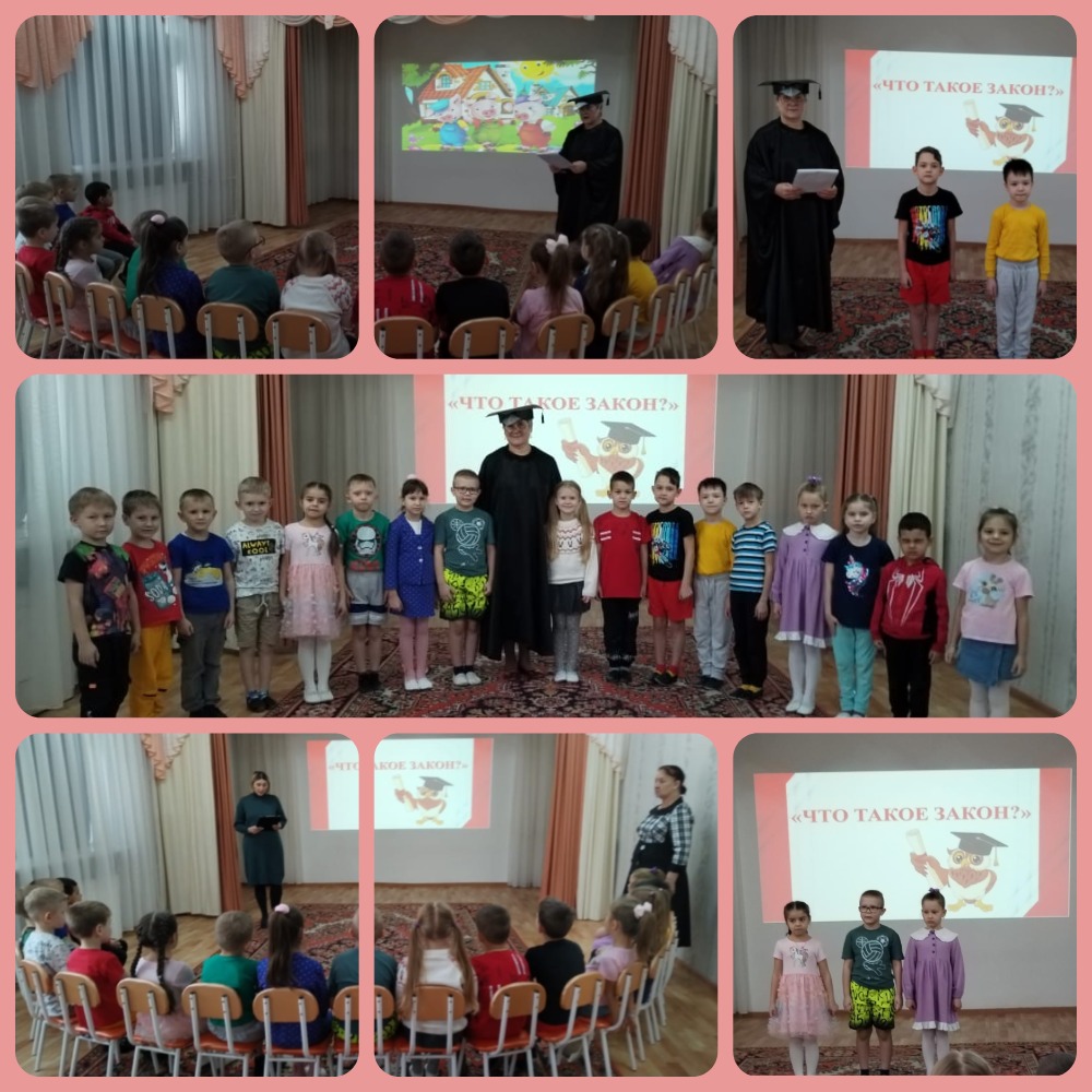 01.12.2023г. Сегодня, в преддверии Международного дня борьбы с коррупцией, в подготовительных группах "Радуга" (воспитатели Бажитова Е. Н. и Мосолова Е. П.) и "Ляйсан" (воспитатели Ганеева З. Г. и Фаттахова Л. С.) прошло мероприятие "Что такое закон?", целью которого является формирование правовой культуры дошкольников.