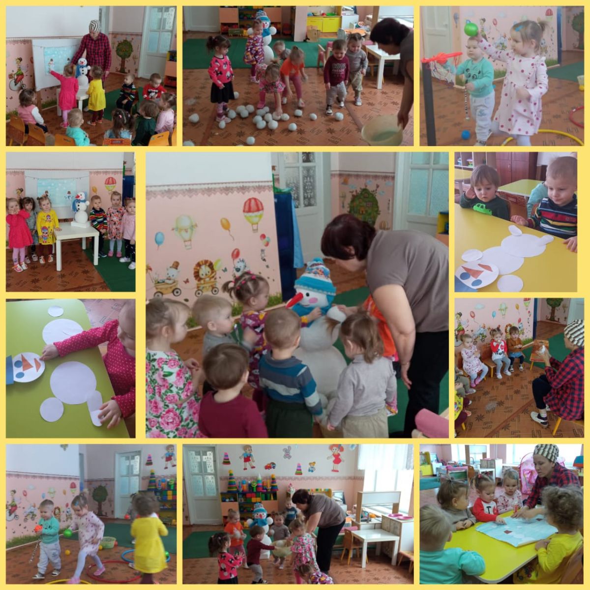 Так как на улице морозно, и наши дошколята ещё малы и не всегда могут погулять на участке, к нам в гости пожаловал Снеговик, который рассказал детям о зимних играх и забавах, и поиграл с малышами. А они на волшебном столе сложили из белых кружочков бумаги Снеговика, чем очень порадовали гостя.