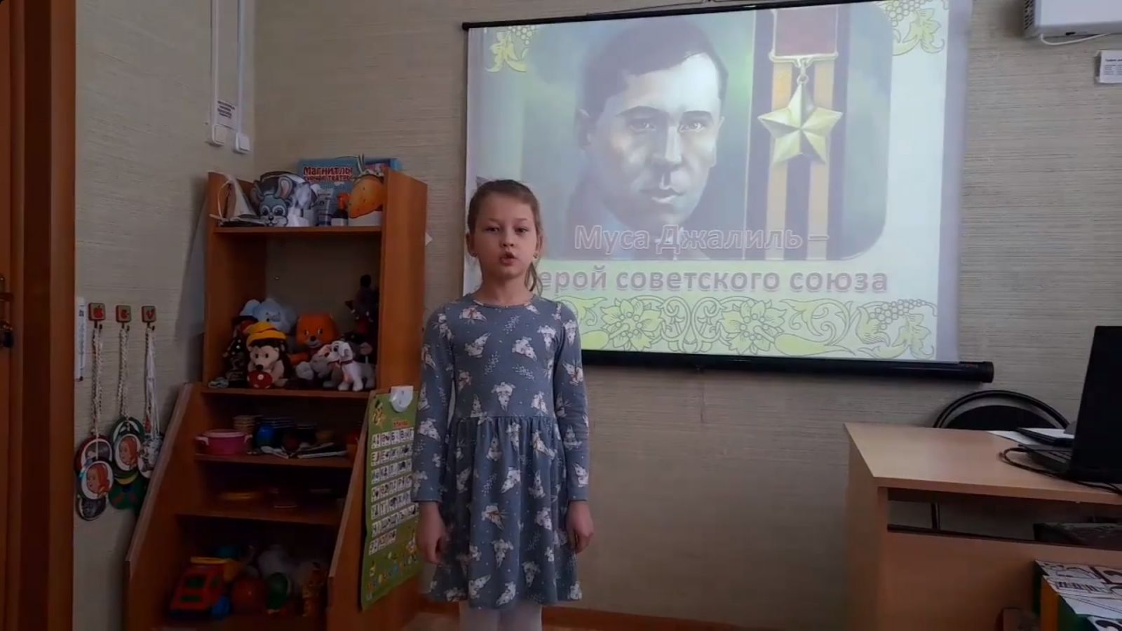 Воспитатель по обучению детей татарскому языку (Бадреева Эльвира Ильдаровна) рассказала об интересных фактах из жизни поэта, его непростой биографии, о его творчестве. Никого из присутствующих не оставил равнодушным просмотр мультфильма по трём стихотворениям Мусы Джалиля: «Праздник матери», «Соловей и ручей» и «Красная ромашка» — в которых поднимаются темы материнской любви, войны и долга.