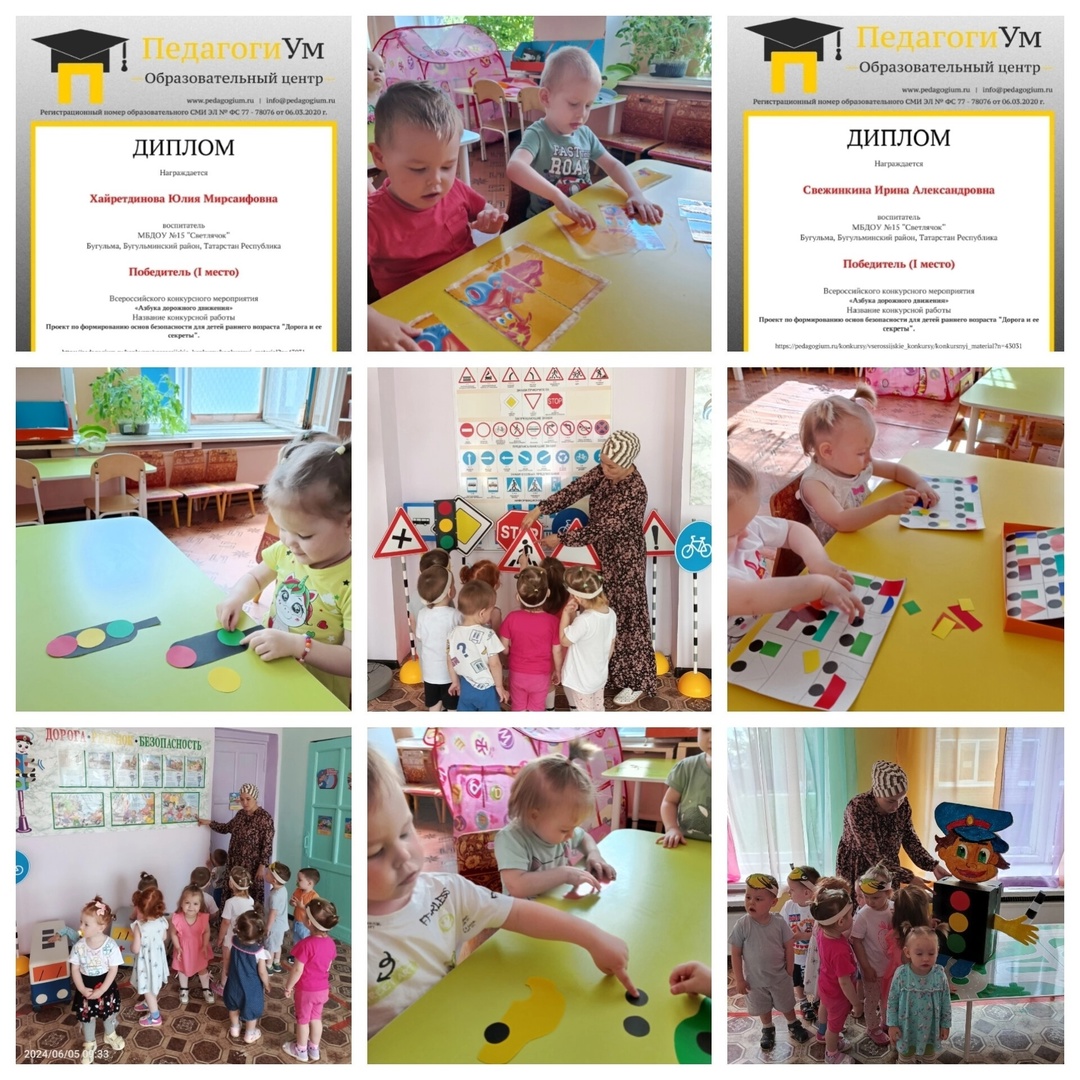 В МБДОУ 15 "СВЕТЛЯЧОК" воспитатели группы "Неваляшки" (Хайретдинова Юлия МирсаифовнаСвежинкина Ирина Александровна) провели проект по формированию основ безопасности для детей раннего возраста "Дорога и её секреты".