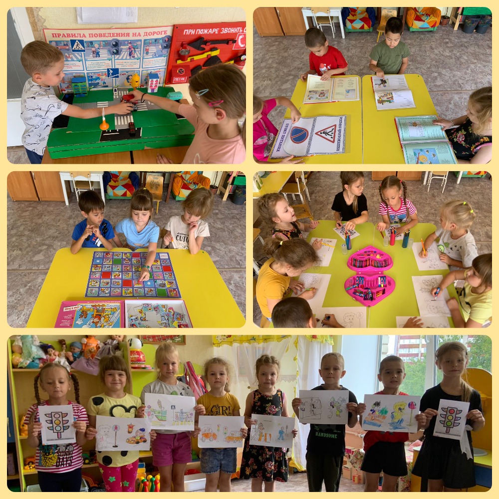 Воспитатель перед прогулкой напомнила детям, что в солнечные жаркие дни нужно обязательно носить лёгкий головной убор, во время проведения подвижных игр вспоминали о соблюдении правил безопасного поведения; правила при играх с песком, что песком нельзя бросаться. Были игры-инсценировки «Кто ты, незнакомец?», «В автобусе». Рисование на тему «Мой друг — светофор».