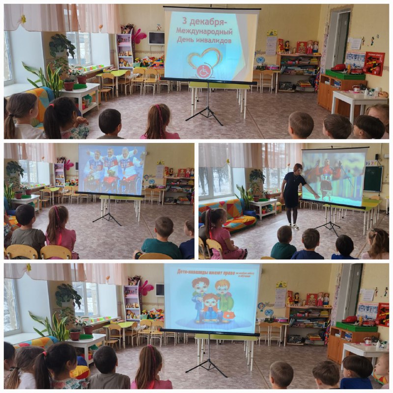 В подготовительной к школе группе "Солнышко" (воспитатели Бородина М.Н., Деркач З.М.) прошло тематическое занятие, посвящённое Международному Дню инвалидов, который отмечается 3 декабря. Педагоги формировали у детей понятие "особых" людей, людей с ограниченными возможностями здоровья, воспитывали гуманное отношение к людям с ограниченными возможностями, доброту, заботу, отзывчивость, чувства сопереживания, милосердия и толерантности к инвалидам.