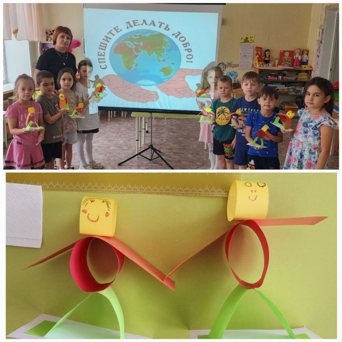 Ребята посмотрели презентацию по данной теме, рассказали какие чувства у них возникли при просмотре. Некоторые дети поделились своими примерами из жизни. А потом дружно и весело изготовили поделку из бумаги "Весёлый танцующий человечек", как символ добра и радости.