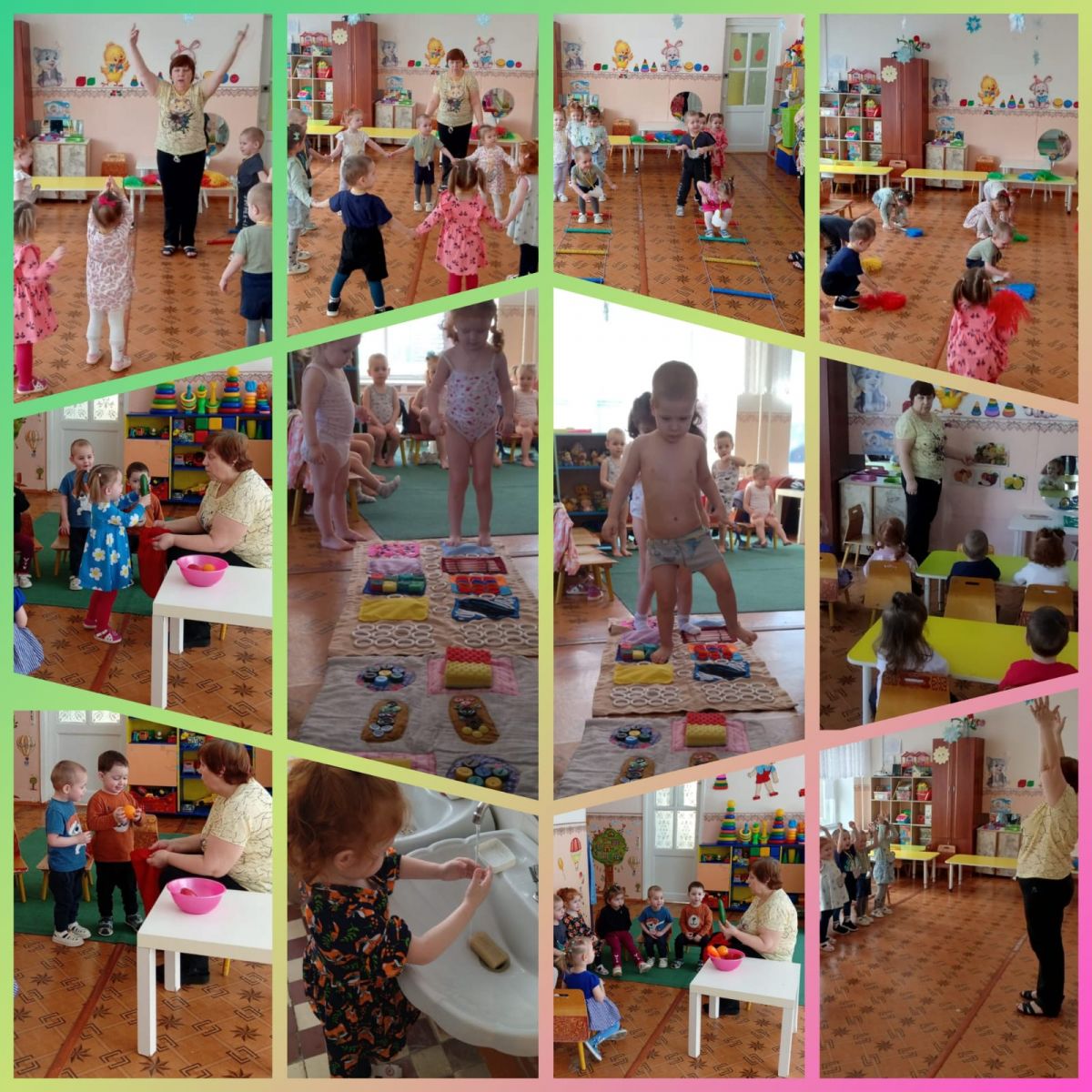 Каждое утро малышей начинается с зарядки "Моё тело". Во время умывания закрепили потешки "Водичка-водичка", "Ой, лады-лады-лады". Продолжаем учить мыть руки перед едой, после прогулки, после туалета: брать мыло в руки, намыливать их, ополаскивать под струёй воды и вытирать своим полотенцем.