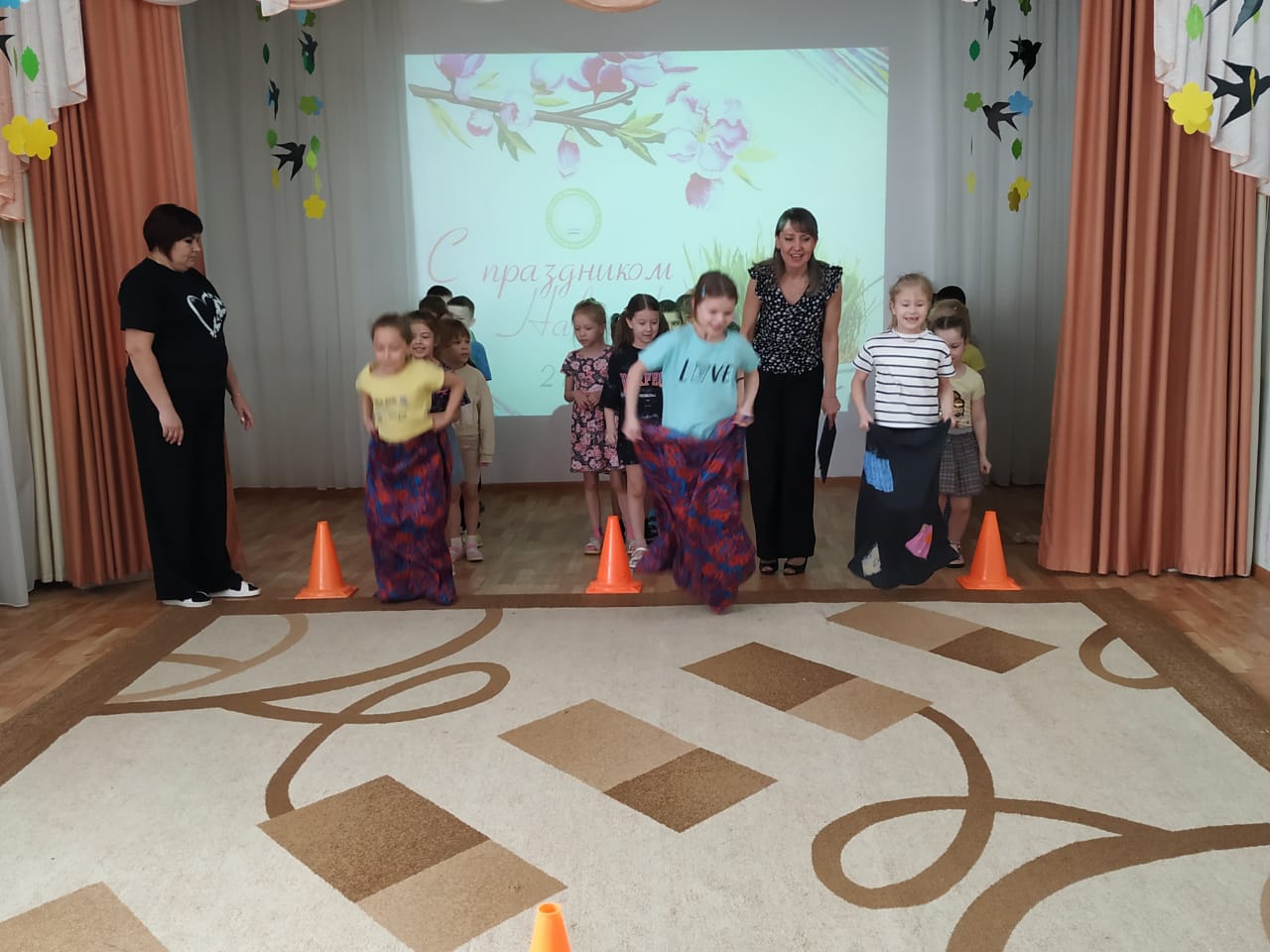 На празднике у ребят побывали Баба-Яга (Деркач З.М.) и Шурале (Юрченко К.М.), которые соревновались в силе, ловкости и быстроте. Вместе с детьми они водили хороводы, пели песни о весне, играли в башкирскую народную игру «Юрта». Дети с большим желанием участвовали во всех играх и эстафетах.
