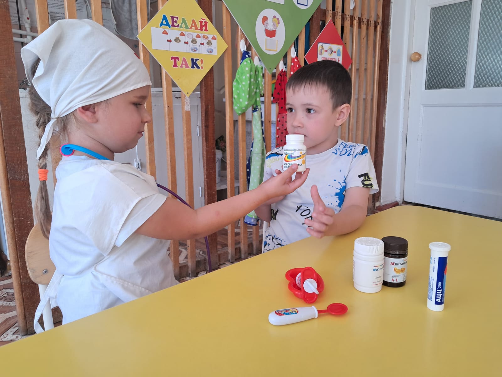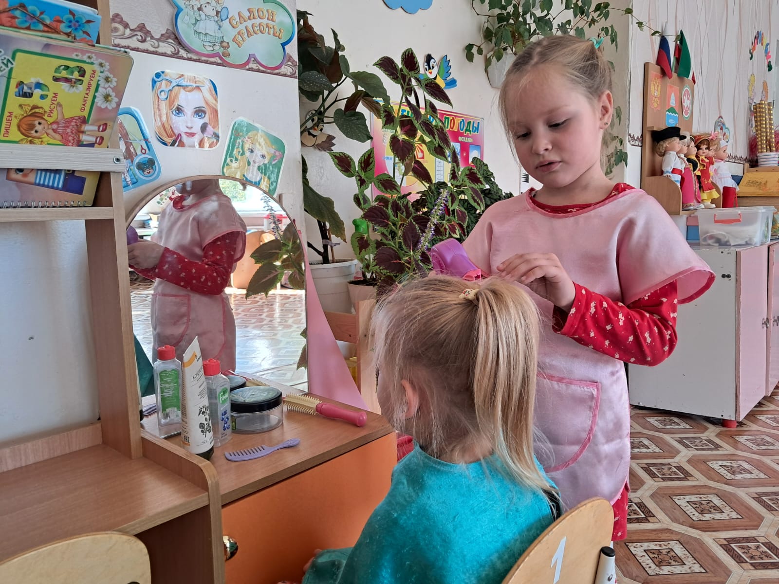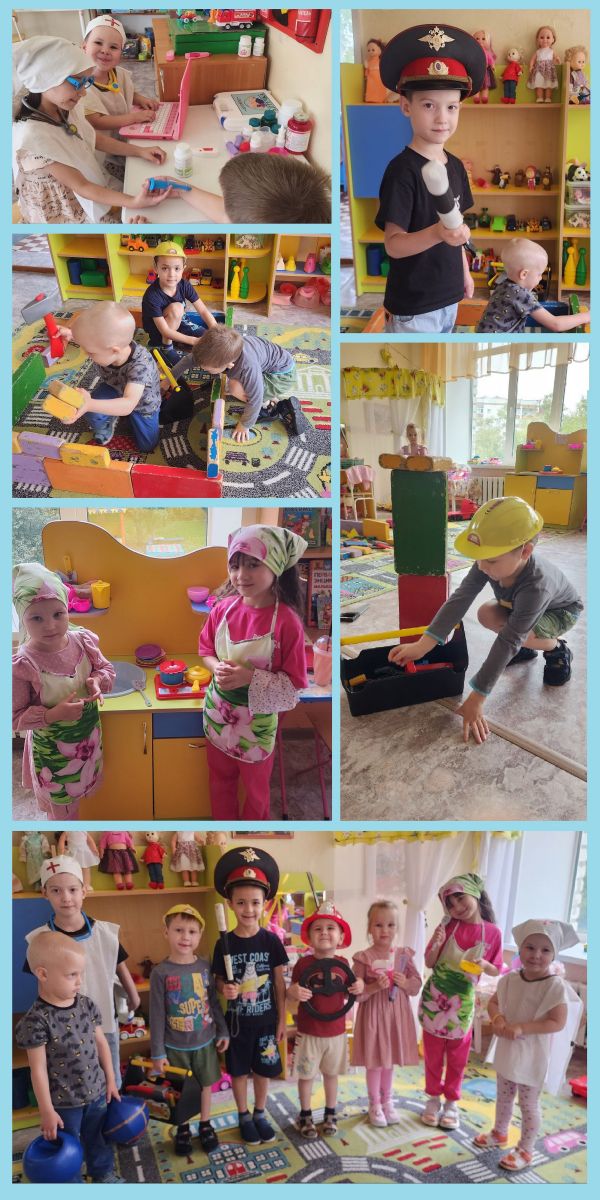 С детьми проводились беседы "Профессии ваших родителей", "Кем ты хочешь стать?"; рссматривали иллюстрации, играли в дидактические и сюжетно-ролевые игры "Назови профессию", "Кто что делает?", "Больница", "Салон красоты"; наблюдали за трудом сотрудников детского сада; все вместе посетили медицинский кабинет детского сада, где наша медсестра Гульназ Минталиповна рассказала о своей работе.