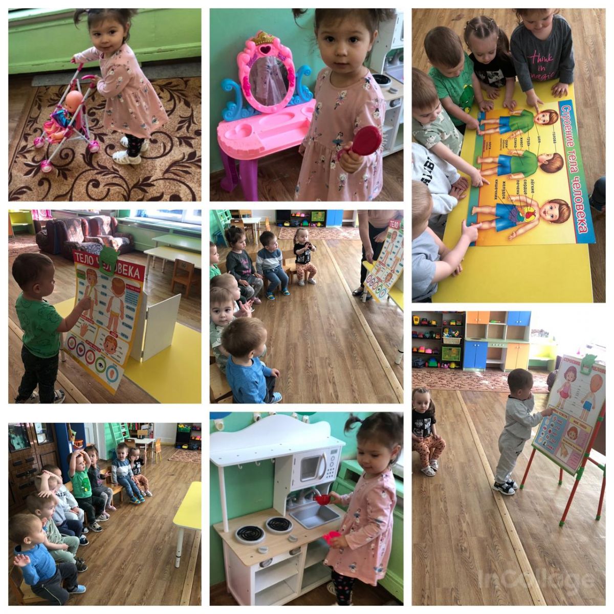 В течение недели малыши, знакомились с частями тела (ножки, ручки, глазки, носик и т д), слушали стихи и потешки, рассматривали иллюстрации. Играли в дидактические игры («Назови что на картинке», «Подбери одежду для куклы»), в подвижную игру «Догони меня». Читали сказку «Теремок», произведения А.Барто «Девочка чумазая» — эти произведения направлены на формирование представлений у детей о добре и взаимопомощи, рассматривали иллюстрации «Моё тело», «Девочка. Мальчик», читали потешки «Водичка водичка», беседовали о «Моей семье». Цель: закрепить знания о членах семьи, умение называть их имена.