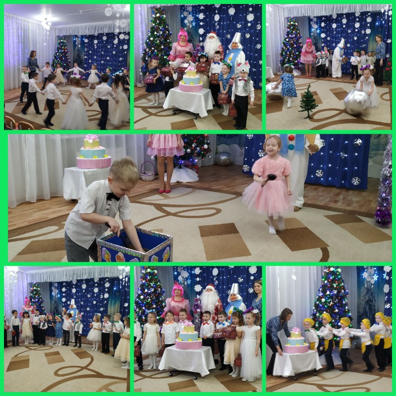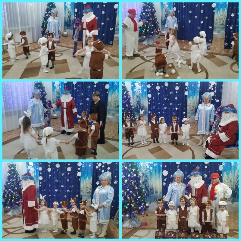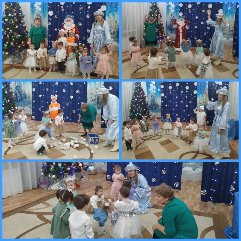 Новогоднее представление началось со встречи детей со Снегурочкой. Все вместе исполняли весёлые зимние пляски, играли с ёлочными огоньками, с погремушками, собирали снежки. А волшебный телефон помог позвать на праздник Зайку и Лисичку, которые принесли ребятам чудесные коробочки с сюрпризом; и пригласить к ребятам Дедушку Мороза с Новогодними подарками.