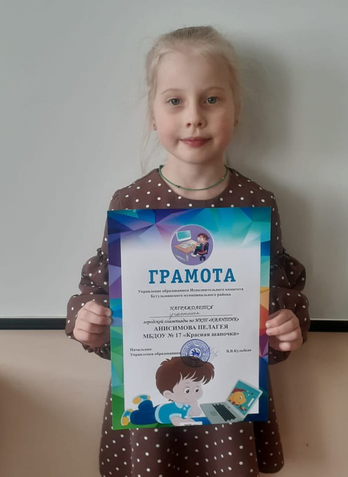 Сегодня наша воспитанница старше-подготовительной группы Анисимова Пелагея стала участником в городской олимпиаде по ИКТ " Квантик" , которая прошла на базе МБДОУ N28 " Сказка ". Желаем нашей Пелагее стремиться к новым победам! Молодец! -