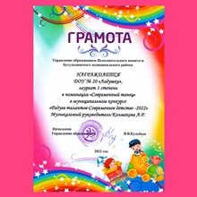 Воспитанники нашего детского сада приняли участие в муниципальном конкурсе "Радуга талантов - Современное детство - 2022". И стали лауреатами 1 степени в номинации "Современный танец". Музыкальный руководитель: Колмакова Альбина Рашидовна. -