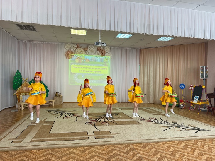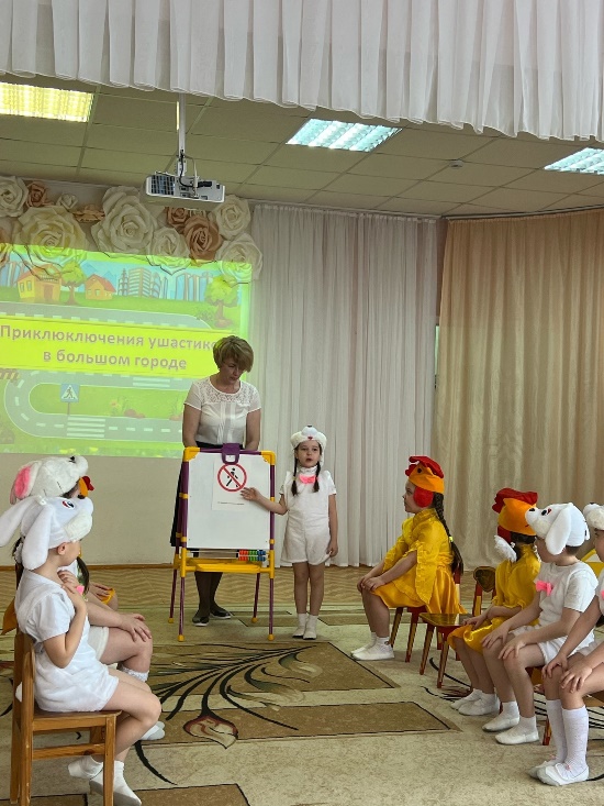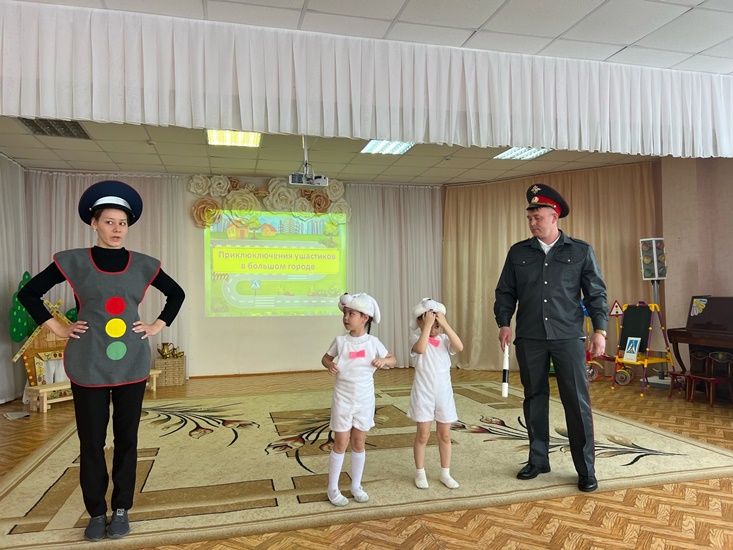 Опубликовано: 20.04.2023В целях закрепления правил дорожного движения в различных практических ситуациях, умения правильно вести себя на дороге в детском саду № 20 «Ладушки» прошло театрализованное представление “Приключения Ушастиков в большом городе".