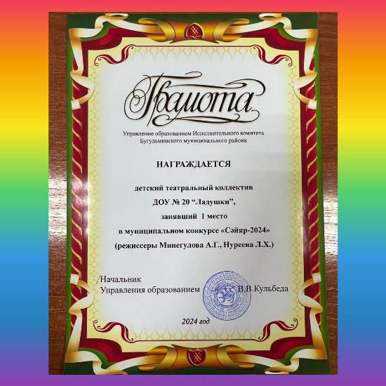 20нче «Ладушки» балалар театр коллективы «Сәйяр-2024» муниципаль конкурсында (режиссер Минегулова А.Г., гримчы-оператор Нуреева Л.Х.) беренче урынны яулады.