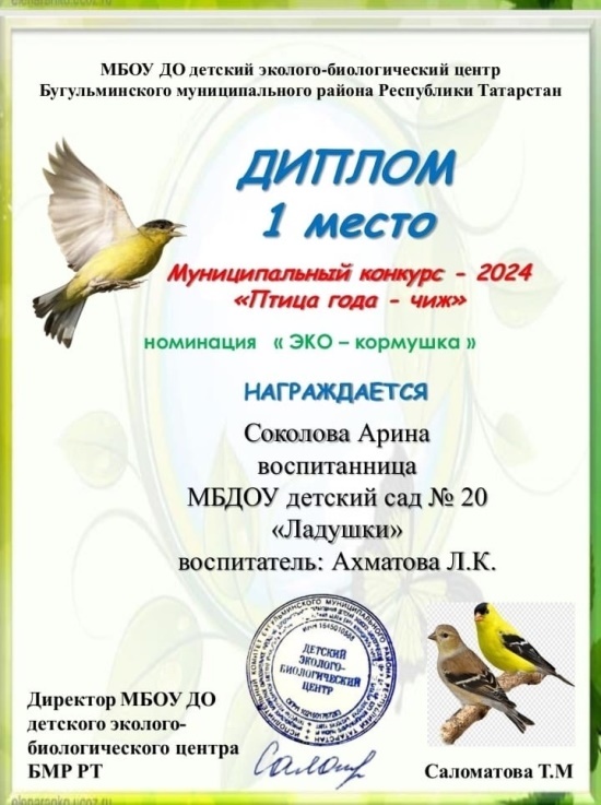 Опубликовано: 29.11.2024Поздравляем воспитателя Ахматову Лейсан Каримовну с победой в муниципальном конкурсе - 2024 «Птица года - чиж» в номинации «ЭКО - кормушка». Желаем дальнейших успехов на творческом пути, новых идей и благодарим за преданность своему делу и педагогическое мастерство!!!
