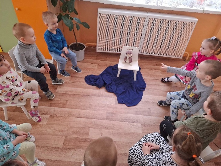 Зайчик попал под дождь и ребята вытерли его насухо, чтобы он не простудился. Мишку сначала уронили, а после пожалели и погладили. Вместе с Таней поиграли в мяч. Лошадке причесали ее красивую гриву. Бычок научил наших малышей ходить по доске.
