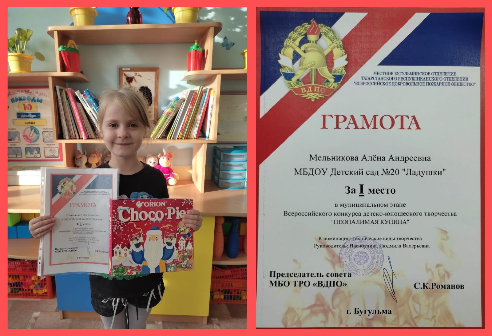 Опубликовано: 10.12.2025Воспитанница подготовительной к школе группы «Пчёлки» Мельникова Алёна приняла участие в муниципальном этапе Всероссийского конкурса детско-юношеского творчества по пожарной безопасности "Неопалимая Купина" и стала победителем, заняв
