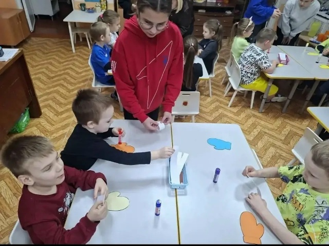 Ребята вместе создавали яркие праздничные поделки — новогоднюю аппликацию в форме весёлых варежек для любимого котёнка Барсика. Дети увлечённо вырезали фигурки снежинок, ёлочных игрушек и звёздочек, наклеивали блестящие элементы декора и придумывали забавные узоры. Каждый старался сделать свою работу особенно красивой и оригинальной.