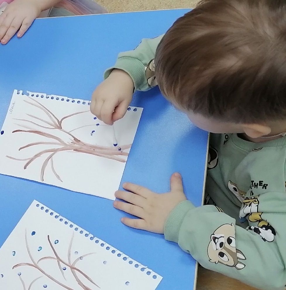 Сегодня малыши группы "Кояшкай" рисовали ватными палочками хлопья снега.