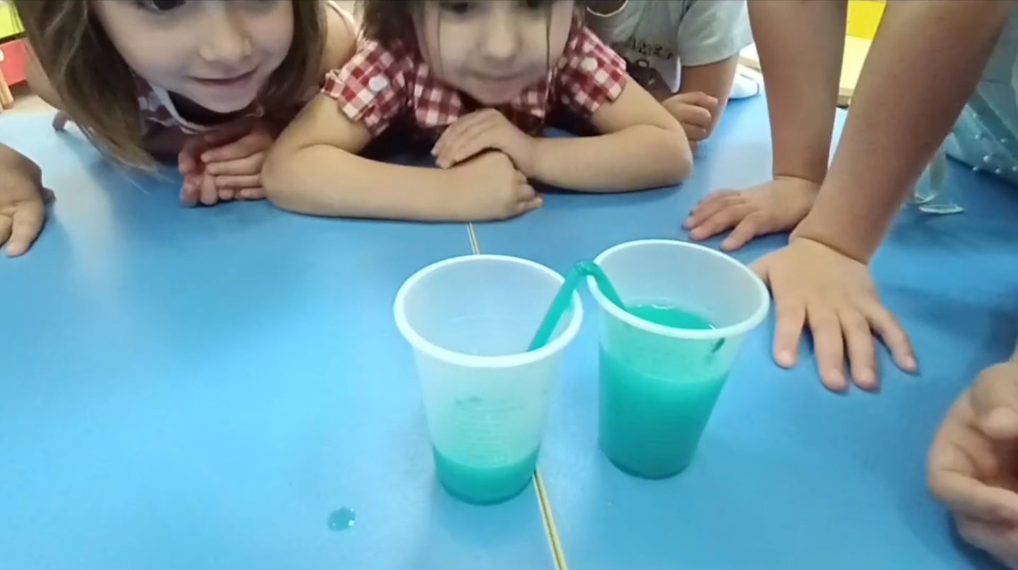 — Помещаем трубочку в пустой стаканчик, поднимаем указательный пальчик, и вода вытекает из трубочки. Подкрашенная вода наглядно сразу же с первого раза позволит увидеть результат.