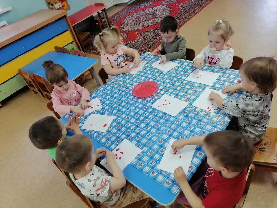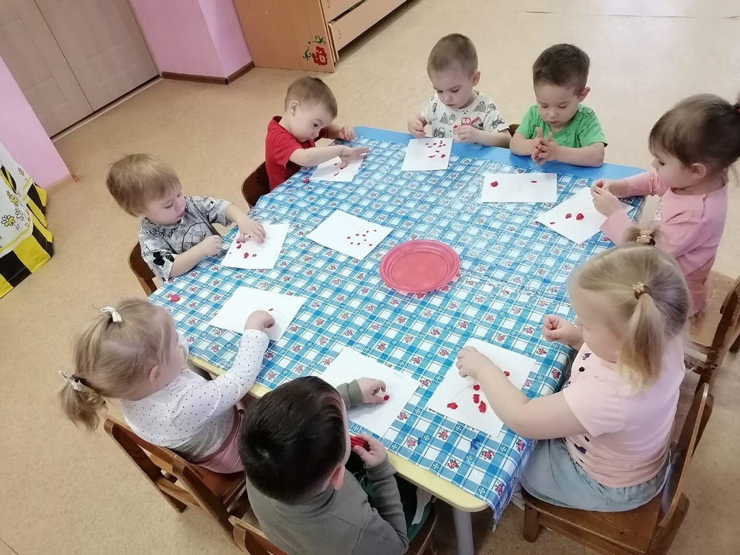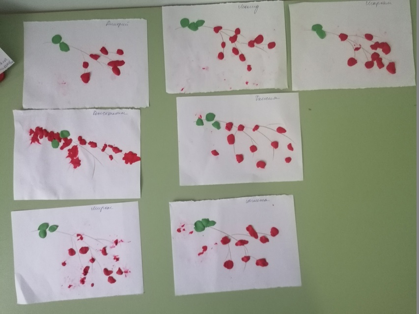 Сегодня малыши первой младшей группы учились лепить ягоды рябины для птиц, отщипывая маленькие кусочки пластилина от большого, и скатывая их в маленькие шарики. А затем приклеивали красные ягодки на лист бумаги к нарисованной веточке.