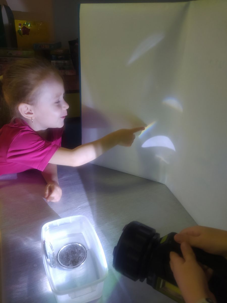 В старшей группе нашего детского сада провели эксперимент "Радуга в темноте". Дети знакомились с радугой, как природным явлением; раскрыли причину её появления (отражение, преломление и разложение солнечного света) .