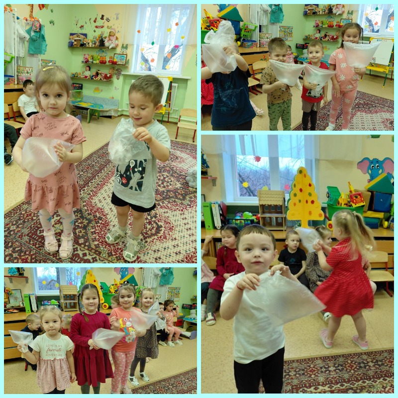 Опыт №2: «Ловим воздух в полиэтиленовый пакет». Сначала ребята получили задание самостоятельно попытаться поймать воздух руками. Конечно же, это оказалось невозможно! Тогда воспитатель показал детям фокус: надо раскрыть пакетик и быстро захлопнуть его ладошками сверху, тогда внутри пакета образуется воздушный пузырь.