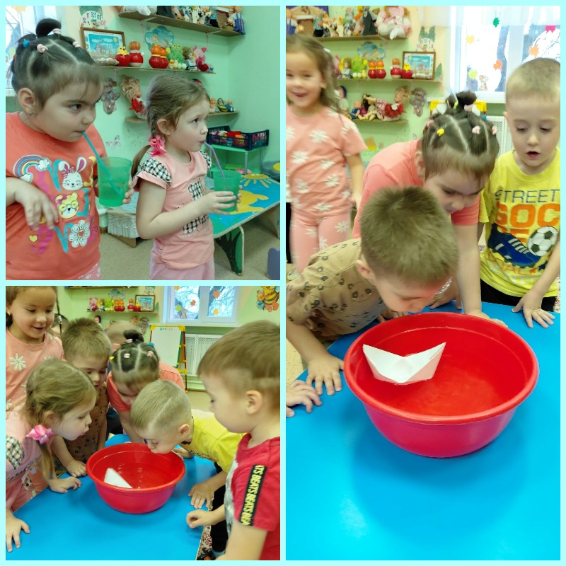 Сделали бумажный кораблик и положил его на воду. Затем мы дули на кораблики, заставляя их двигаться вперёд. Так мы увидели, что воздух обладает силой и способен двигать предметы.