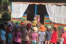 Для успешной реализации свободного художественного творчества детей дошкольного возраста в летний период в нашем детском саду функционирует творческая площадка "Театральная". В теплое время года праздники, как правило, проводятся на улице. На сцене летнего театра можно петь и танцевать, вручать награды, проводить конкурсы и просто играть в театр. С раннего детства всем известна русская народная сказка «Колобок». По мотивам этой сказки организовали театрализованное представление на нашей творческой площадке с детьми средней и старшей групп.