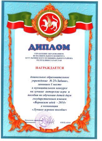 Диплом за 1 место в муниципальном конкурсе на лучшее игровое пособие по обучению детей двум государственным языкам
