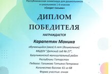 Поздравляем Карапетян Монику с победой в Республиканской олимпиаде для дошкольников и школьников 1-6 классов "Секреты письма"! Это великолепное достижение свидетельствует о ее невероятном таланте, усердии и любви к слову. Пусть этот успех станет лишь первой ступенькой на пути к новым достижениям и свершениям. Желаем дальнейших успехов в учебе, творчестве и во всех начинаниях! Мы уверены, что талант и старание помогут достичь еще больших высот.