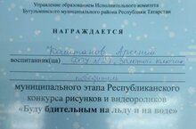 Поздравляем воспитанника нашего детского сада Каштанова Арсенияс победой и статусом "Победитель" муниципального этапа Республиканского конкурса рисунков и видеороликов "Буду бдительным на льду и на воде"! Желаем творческих успехов!
