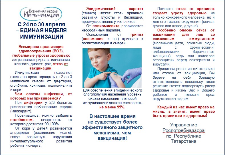 В соответствие с письмом Руководителя Управления Федеральной службы по надзору в сфере защиты прав потребителей и благополучия человека по Республике Татарстан (Татарстан) от 18.04.2022 № 07/7932 «О проведении ЕНИ-2022» Министерство образования и науки Республики Татарстан сообщает, что в период с 25 по 30 апреля 2022 года проводится Единая неделя иммунизации (далее – ЕНИ-2022). Основная цель ЕНИ-2022 – повышение уровня знаний населения о важности иммунизации в предупреждении инфекционных заболеваний.