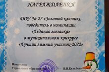 Зима дарит нам особенные радости, забавы на льду, на снегу, и поэтому команда родителей, воспитанников и педагогов нашего детского сада «Золотой ключик» , приняла активное участие в городском конкурсе «Лучший зимний участок-2022». Сколько радости детям и взрослым доставило это мероприятие! Кто-то катал комья, кто-то расчищал участок от снега, кто-то помогал лепить постройку, все были заняты и никто не стоял в стороне. Жюри по достоинству оценила нашу работу и наградило нас Дипломом победителя в номинации «Ледяная мозаика»!