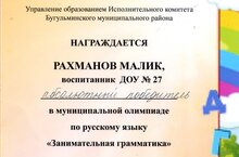 2 нче әзерлек төркемендә тәрбияләнүче Малик Рахманов рус теле буенча "Занимательная грамматика"муниципаль олимпиадасында абсолют җиңүче булды! Җиңүегез белән котлыйбыз! Бу уңыш-Маликның тырышып эшләве һәм тел белән мавыгуы нәтиҗәсе. Аның тырышлыгы, һичшиксез, башка балаларны рус телен тирәнтен өйрәнергә рухландыра. Без Маликның казанышлары белән горурланабыз һәм аңа киләчәктә дә уңышлар һәм интеллектуаль өлкәдә яңа җиңүләр телибез! Рус телен ярату аның тормышында ышанычлы компас булсын.