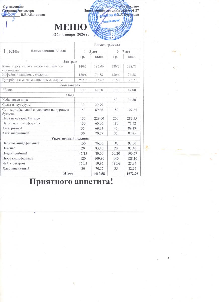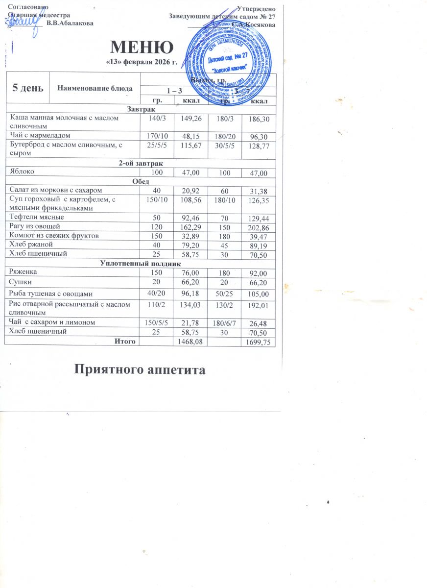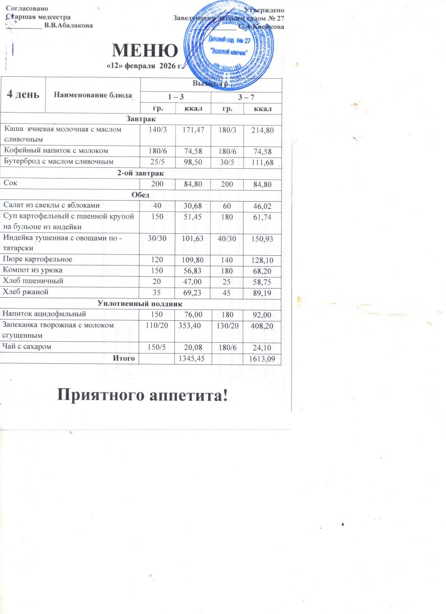 Примерное 10-и дневное меню с 12 - ти часовым пребыванием от 3 лет до 7 лет