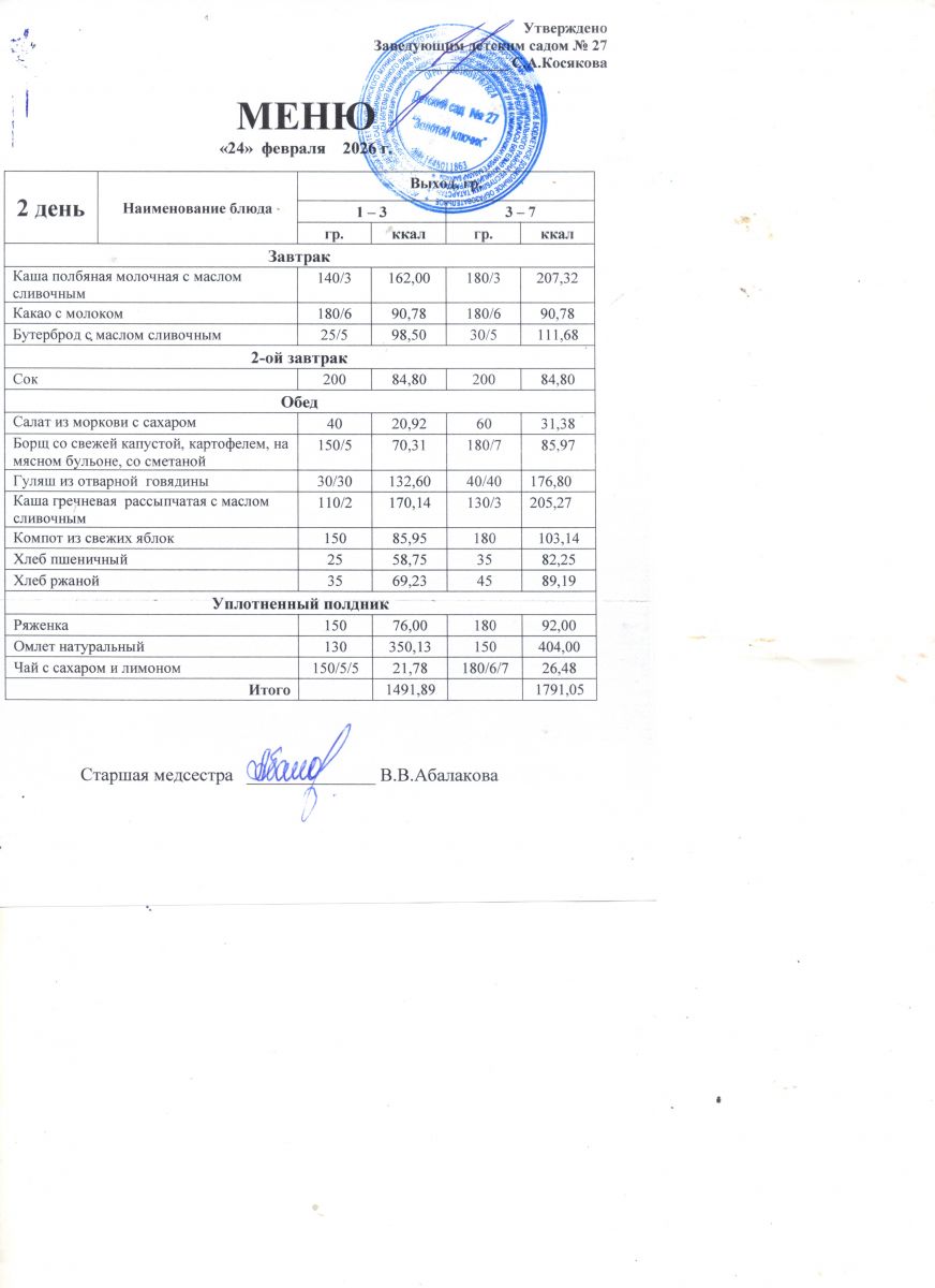 Старшая медицинская сестра Детского сада № 27: Абалакова Валентина Викторовна.