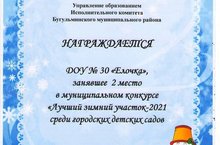 Ежегодно мы участвуем в муниципальном конкурсе «Лучший зимний участок» и занимаем призовые места. В этом году воспитатели детского сада приняли самое активное участие в совместном с родителями изготовлении снежных фигур, тематика которых была единой – «Правила поведения на дороге». При входе в детский сад дошколят и их родителей встречает символ года – Бык и, конечно же, инспектор ГИБДД-снеговик. Мы заняли почетное второе место в муниципальном конкурсе «Лучший зимний участок – 2021». Ура!!!