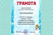 Шәһәр балалар бакчалары арасында «Иң яхшы кышкы участок-2022» муниципаль бәйге нәтиҗәләре буенча, безнең балалар бакчасы 1 урынны яулады. Котлыйбыз!