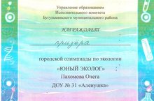 Наш воспитанник Пахомов Олег в городской олимпиаде по экологии "Юный эколог" стал призером.
